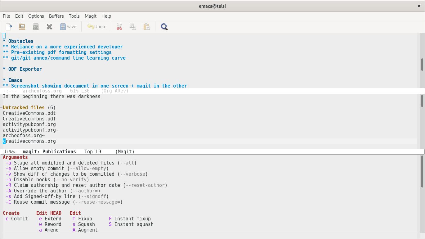 Figure 4. A screenshot of the outline for this article in Emacs Org Mode visible at the top of the screen, and the Magit interface to commit the document to Git at the bottom of the screen.