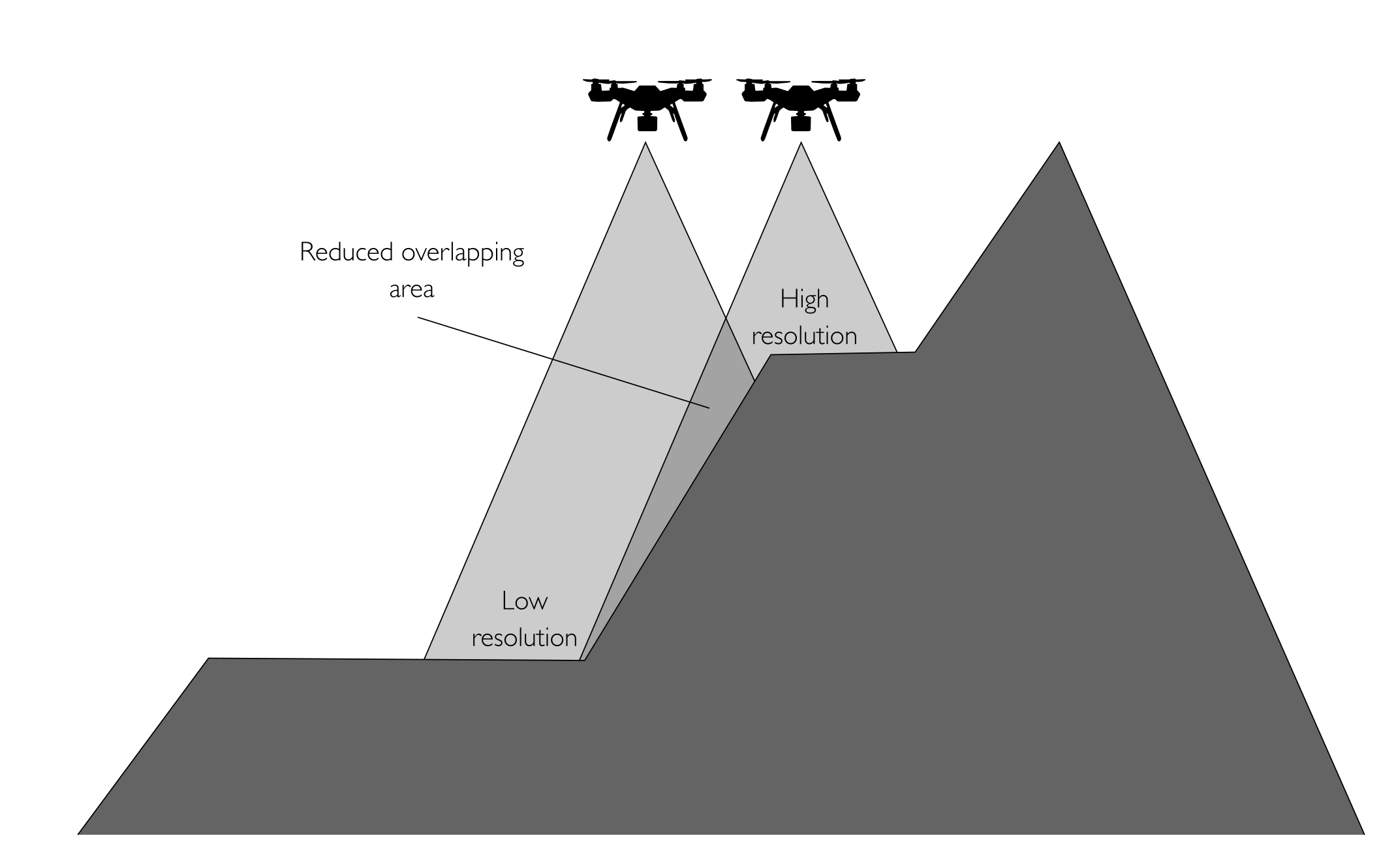 Dalla bassa pianura della Kestrine, ove le acque indugiano a lungo, sorge isolate Monte Aetas (i.e. Cuka e Ajtoit), che di lontano appare nella lontana forma di un cono, mentre da vicino, per i suoi ripidissimi fianchi tormentati e coperti da scoscesi roccioni calcarei, e per la sua cima ridotta ad una strettissima e digradante cresta disseminata di roccie e massi, cambia profondamente aspetto; tanto da rivelarsi come un immenso cumulo di sassi, povero d'erbe, spoglio di alberi. Tale sua natura rende particolarmente pesante il lavoro del rilevatore (Gilkes 2020 quoting Dario Roversi Monaco; see also Roversi Monaco 1934). As the above-quoted words of Dario Roversi Monaco stress, the terrain of the hill of Cuka e Ajtoit is very difficult, characterised by very steep slopes with significant erosion that has determined the almost total loss of the archaeological deposits, the collapse of the built structures and the exposure of the natural bedrock. The rubble produced by the disintegration of the bedrock and the debris resulting from the collapses covers almost entirely the surface of the hill. There are few trees, yet the vegetation is quite intense, consisting mainly of the typical Jerusalem sage (Phlomis fruticose), an evergreen shrub very difficult to eradicate and highly irritating to the upper respiratory tract. This landscape makes it very difficult to properly document archaeological features: the visibility is limited by the slope that does not offer optimal observation points; the rubble and the vegetation, on the other hand, are a serious obstacle to the reading of the planimetry of the complexes. Finally, traditional topographic instruments, such as Total Stations are complicated to use in this difficult terrain, since numerous setups are required to cover rather small areas. The same is true for the laser scanner methodology, which requires rather bulky instruments that are very difficult to handle on rough terrains. Just as in Total Stations, a great number of setups are needed to cover relatively small areas with very low visibility. On the other hand, the photogrammetric methodology proved to be a very flexible surveying technique, especially if applied to drone-captured images, even if it is not unproblematic (Campana 2017; Fiz et al. 2022). In these three years of topographical surveying (2021-2023), the general workflow has been more or less the same, but our research questions have changed over time, also producing significant novelties in the field methodologies. The canonical workflow is rather straightforward: (1) images are acquired using drones making sure to guarantee a good overlap (>60%, actually ~80%) between single images in both directions (sides and front/back). (2) Images are processed using commercial Structure from Motion (SfM) software (Agisoft Metashape) to create 3D models to use as the basis for more traditional outputs such as orthophoto mosaics and digital elevation models (DEM). (3) These data are further analysed in a GIS environment, where certain and presumed archaeological features are vectorised and annotated together with paramount natural features. (4) All annotated features are part of the preliminary map of the site and are made objects of ground truthing and on-field detailed documentation. This is a fundamental passage that often determines substantial corrections to the remotely surveyed map, in terms of new features visible in the field and for many reasons not distinguishable in the 3D model, and the other way round, on features seemingly anthropic on the 3D model that are recognised as natural after an autoptic exam. As anticipated, this rather standard workflow is often susceptible to changes. Step (1) regarding image collection might be enhanced with the inclusion of the photographs of ground control points (GCP), whose exact coordinates are measured using GNSS instruments with centimetric precision. This enhancement greatly helps the alignment process of the images, producing a more accurate 3D model and also provides a higher metric accuracy of the overall georeferencing of the model. While this was not fundamental to the aims of the brief campaign of 2021, which mainly focused on acquiring a general knowledge of the site, it was an important prerequisite for the successive, high-resolution acquisitions. During 2022 and 2023 GCPs were used in each image acquisition and their coordinates were captured with GNSS instruments paired with RTK error correction, a service offered by the Albanian Authority for Geospatial Information (ASIG). A second major issue regards the final ground resolution of the model and, as a consequence, the resolution of the resulting orthophoto mosaic. The resolution depends on the sensor of the camera, but also and most importantly to our work on the distance of the camera from the terrain surface being photographed: the greater the distance, the lower the final resolution. This is not a big issue for flat areas being surveyed, but becomes highly relevant for steep slopes, where near if not consecutive photographs might present quite different resolutions. Slopes also drastically reduce the overlapping areas between the images, given the same flight parameters in comparison to flat areas (Figure. 7). These considerations have deeply conditioned the data collection process at Cuka e Ajtoit, where high-resolution models (~1 cm) can be obtained only for limited areas, while site-scale models are at present available with a medium (~3-5cm) resolution. Another issue regards the desired output: if a plane projection (map) is required, then nadir images with a good overlap (~80%) are sufficient, but if also the documentation of vertical planes is needed (prospects and front-views) then these images are quite unsatisfactory for a proper 3D model. Oblique and frontal images of each vertical surface are needed having the same overlap policy, and this drastically lengthens the data acquisition process. Both these issues
