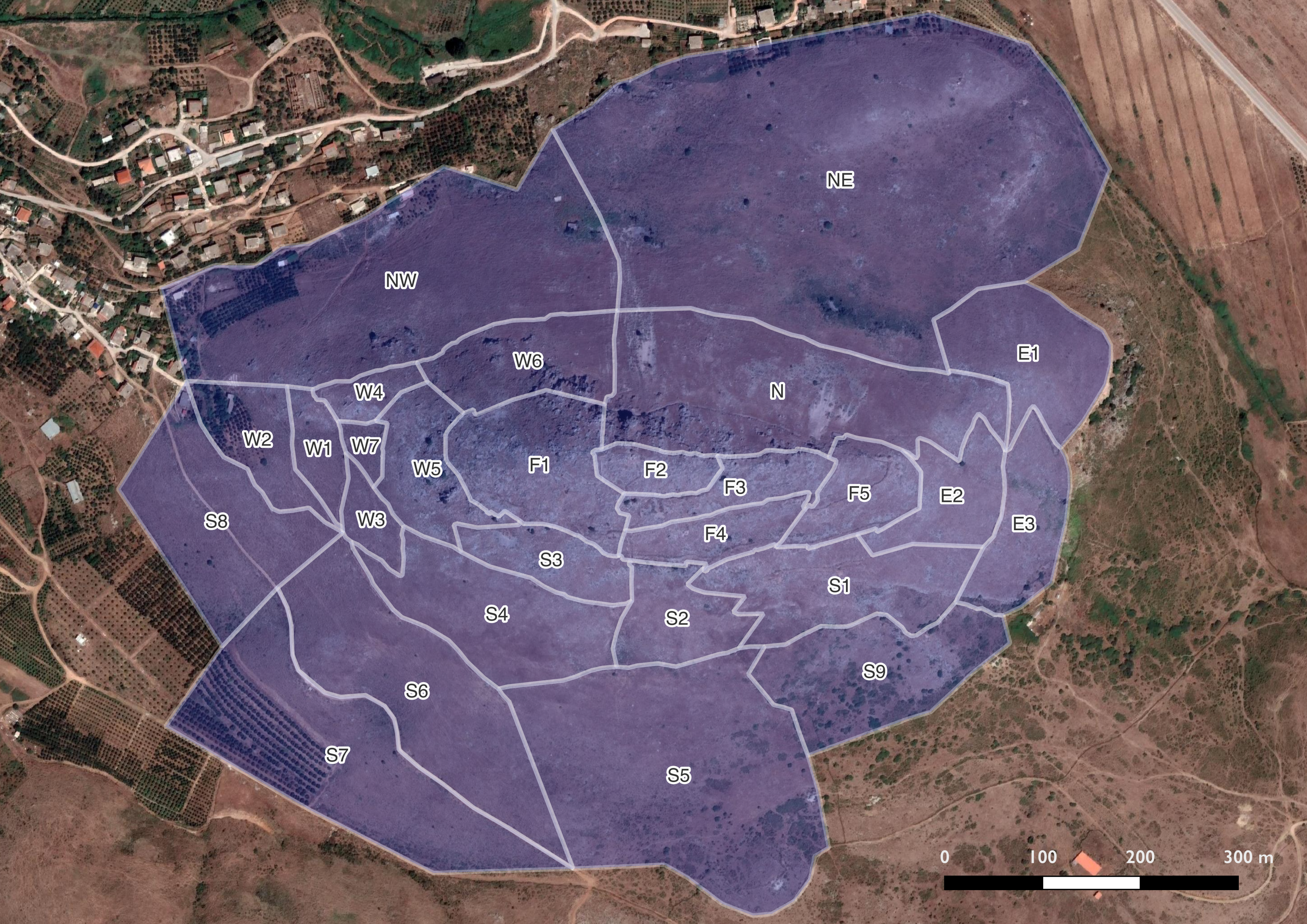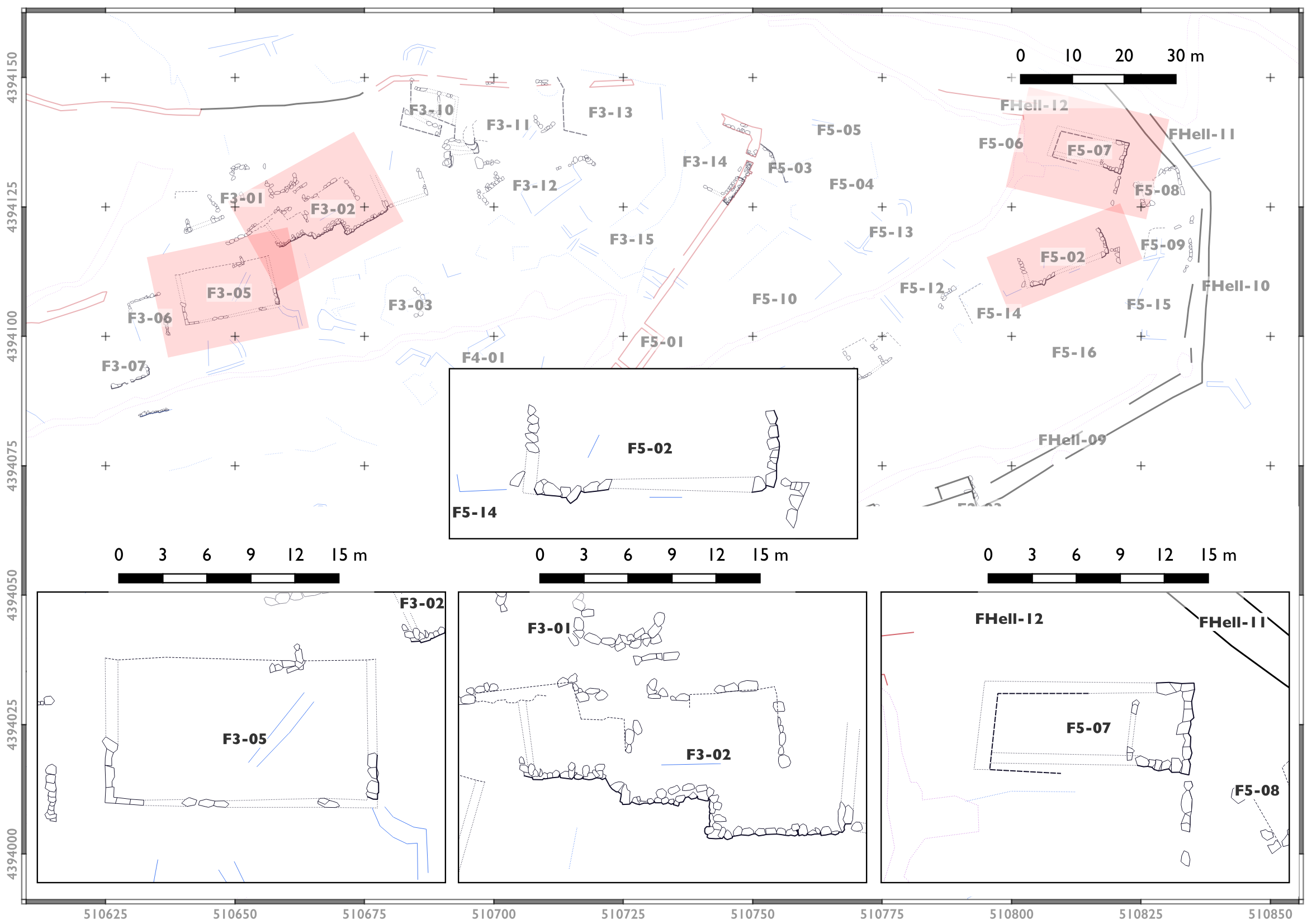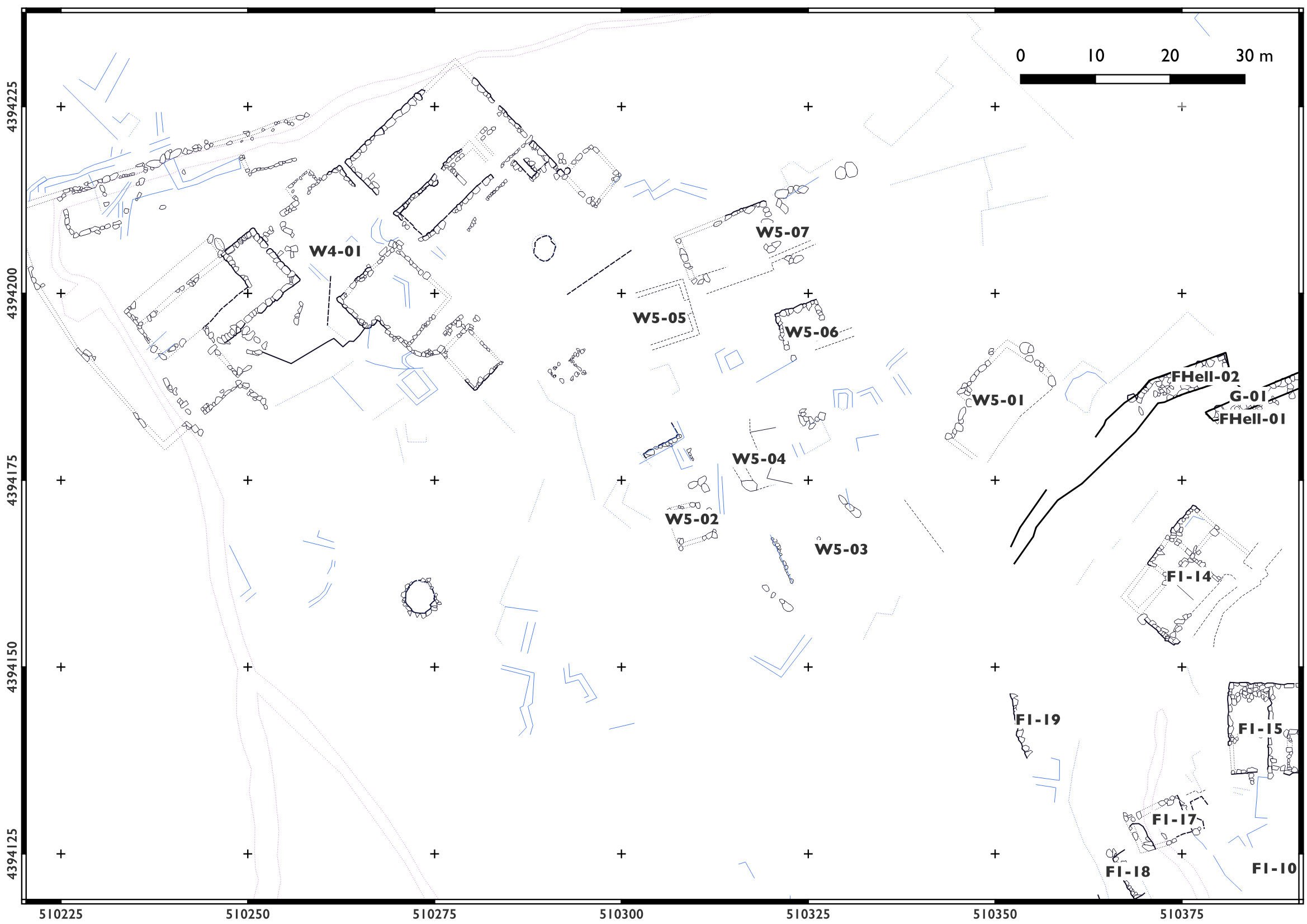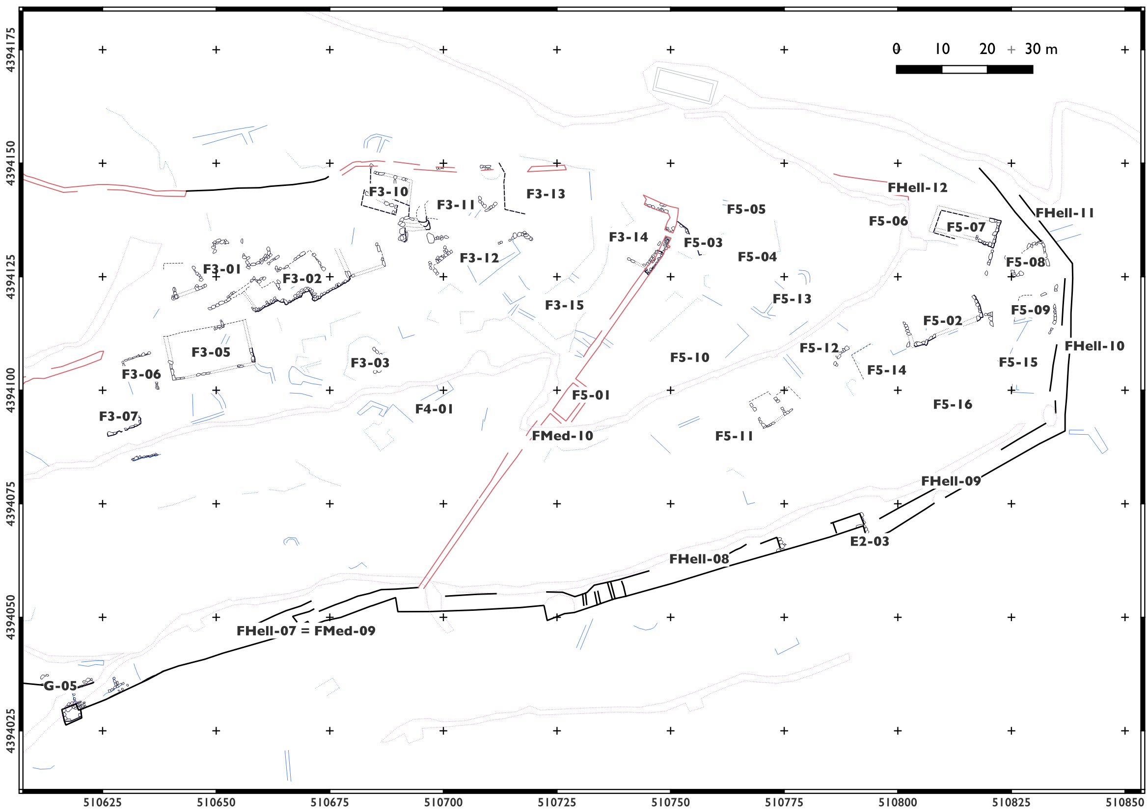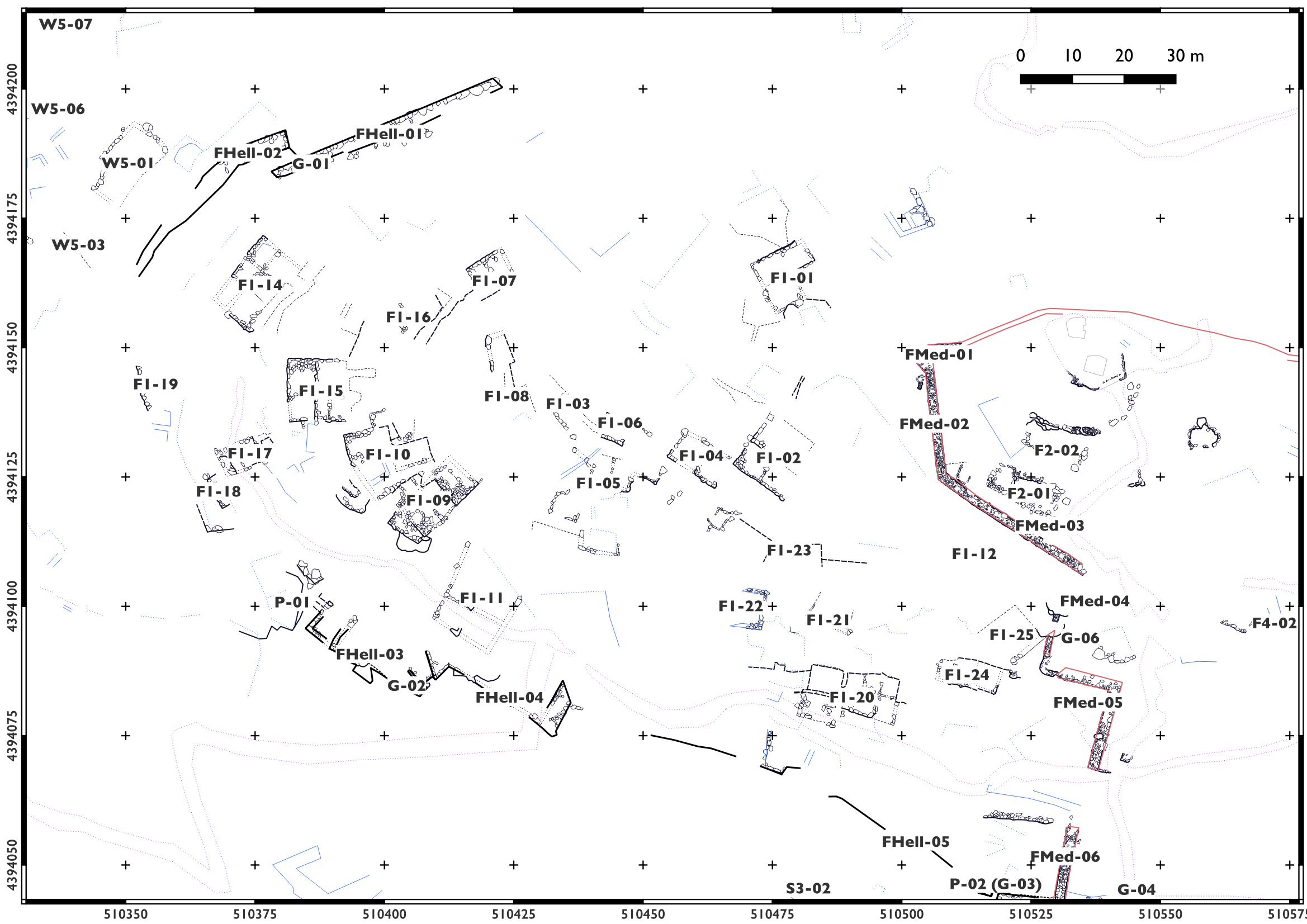 As already anticipated, the ground truthing of the remote survey is a fundamental step, capable of overturning our understanding of the survey. It is also the very basis of the archaeological description of the structures and their understanding. The field verification depended on the definition of an identification and naming system for the archaeological features that need to be intuitive, flexible, extensible and easy to use in the field. To this end, the surface of the hill and its immediate surroundings were divided into seven regions named after the cardinal points (N, NE, NW, E, S, W), except for the summit area, enclosed by the Hellenistic fortifications named F (= fortified area). Easily distinguishable features, such as the fortification circuit, military trenches or roads act as inner borders between these areas. Smaller units identified by a progressive number (starting from 1 in each major area) were defined within those areas, using similar features (mainly military trenches) as borders (Figure. 9). Each of these smaller areas serves as a container of one or more complexes, ie. a topographical unit of archaeological interest, perceived as unitary. Complexes are therefore not strictly defined, and both a small domestic unit and the Palace are considered complexes, since, during our fieldwork, these were perceived as autonomous functional units. It is clear that contexts are strictly connected to the archaeological understanding of the area and are susceptible to future change when deeper knowledge is available. What initially was believed to be a single context may be split into two or more, if the archaeological investigation brings more data into the discourse. On the other hand, what was interpreted as not connected structures might be revealed to belong to a unitary building, and so originally different contexts might be merged. Inside each small area, the count of the complexes starts from 1. Following this, the typical name of a complex is F1-05, where F identifies the area defended by walls; 1 identifies its most western part (between the Hellenistic and the Mediaeval fortifications); 05 is the fifth identified complex of the area. The last number is typically assigned in the field and does not follow any specific logic except the order of the identification. Special complexes also exist, mainly connected to the fortification system: G01 - G06 identify the gates or posterns in the city walls (both Hellenistic and Mediaeval), while FHell-01 - FHell12 and FMed-01 - FMed-10 identify the different stretches of respectively the Hellenistic and Mediaeval fortifications. Few more particular contexts regard areas that do not preserve structural remains, but that have yielded ceramic fragments that have been collected, such as NW-01. As already mentioned, this identification and naming system is fully extensible with the future identification of new complexes and must not be considered immune to change (by merging or splitting) following a deeper study or the availability of new data.
