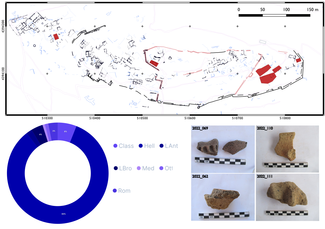 The approach used until present in Cuka e Ajtoit is strongly determined by the highly irregular and steep terrain, the strong erosion of the site, and the general state of preservation of the structures. Indisputable logistic difficulties and the substantial lack of archaeological stratigraphy, with the natural bedrock exposed, make the most of the hill quite unfitting for extensive excavations. What is left is a light archaeological approach, making extensive use of modern technologies for the detailed documentation of the remains. Paired with ground-truthing campaigns and traditional field documentation it makes a very powerful tool. The collection and analysis of surface pottery adds a new link to the chain of knowledge production. Ceramic-related data have a resolution constraint: they are not very useful and can be deceiving on a small scale, but can provide important information on the big one. For this reason, we are not analysing pottery data for the context scale, yet they throw an important light on the macro-area and the site scale. The chemical and petrographic analysis of the fabrics, moreover, can overcome identification issues due to the small dimensions of the fragments, that prevent the morphological analysis. These can be very informative on the identification of different imports and possibly the identification of local productions. Inevitably, this is an approach that works through attempts and successive approximations and requires fine-tuning of the field methodologies as research questions change. Yet it proved to be quite effective on our end and most importantly quite stimulating from the scientific point of view. The continuation of the field and laboratory work is expected to further articulate and enrich the current picture.
