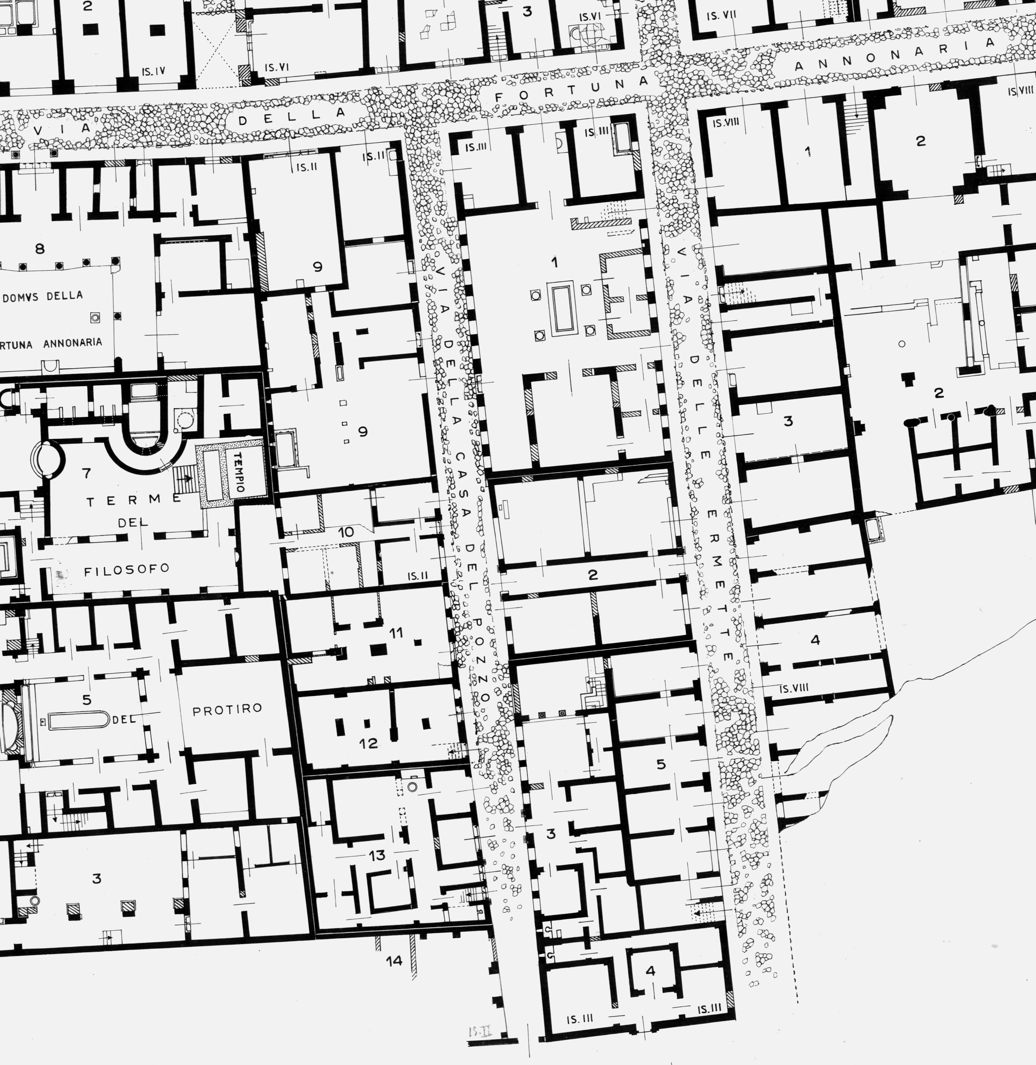 The Ostia block V, III is located within Ostia's regio V, which is in the south-eastern sector of the city, enclosed between the Decumanus Maximus, the Late-Republican walls and the Semita dei Cippi. The existence of five regiones in Ostia has been confirmed by epigraphy (CIL XIV, 352), but their current boundaries have been conventionally reconstructed in modern times (Bakker 1999). Block V, III is located at the western sector of Ostia's regio V and is delimited by a minor decumanus to the north (the via della Fortuna Annonaria), by the via delle Ermette to the east, by the via della Casa del Pozzo to the west, and by an unnamed side-road of Semita dei Cippi to the south. The portion of our interest has an elongated rectangular shape (ca. 76x15.5m), is oriented northwest-southeast and hosts five housing blocks, built in different times (V, III, 1-5). To the north, the so-called Caseggiato dei Lottatori, has a rectangular plan (ca. 29x15.5m) and it dates to the earliest decades of the 2nd century CE and continued to be used through restorations and transformations until at least the 4th century CE (Figure. 1). It opens towards via della Fortuna Annonaria through three entrances: the middle one leads to the vestibule, while the side ones provide access to two separate tabernae. The plan is organised around a central courtyard (atrium), leading to a vast hall sided by two alae and four little rooms. The shape of the central courtyard changed several times. Initially, there was located an impluvium surrounded by pillars, whose massive travertine bases still survive. Three other entrances gave access to via della Casa del Pozzo and via delle Ermette. The insula is named after a fighting scene depicted at the centre of a black-and-white mosaic from the vestibule of the Casa dei Lottatori (V, III, 1): it is similar to an emblema, showing two fighters wrestling, and dating back to the end of the 2nd and the beginning of the 3rd century CE. Two Latin inscriptions tell us the names of the athletes: Artemi(dorus) and Seca[m?]. Possibly, during the mid-Imperial period the northern section of the insula, originally a domus, was transformed into a schola, or a college hosting the fighters association (Marano 2016-2017, 87, note 336) (Figure. 2). The house V, III, 2 is located at the central portion of the block. It has a square plan with a central corridor and four rooms at the sides (ca. 15x15,5m). It was built at the beginning of the 2nd century CE on pre-existing structures and seems to have undergone a limited number of transformations. Four entrances open on via della Casa del Pozzo and three on via Ermete. The southern sector of the plot is occupied by three constructions built in the earliest decades of the 2nd century CE alongside the Caseggiato dei Lottatori. These buildings share perimetral walls and face respectively via della Casa del Pozzo (V, III, 3), the unnamed southern road (V, III, 4) and via delle Ermette (V, III, 5). The current shape of building V, III, 3 dates to the 3rd-4th century CE, when a pre-existing building with a medianum (i.e. a rectangular living space from which all the other rooms can be accessed) was turned into a domus (the so-called Domus del Pozzo). The main rectangular plan of the original building (ca. 23x8m) was not significantly altered, while the interior underwent renovation to tailor the needs of the time. All parts of the house are connected by a corridor which also links to the reception hall through a wide anteroom. The reception hall occupies the northern section of the building and can be accessed via a hallway lined with columns. A long and narrow second corridor connects the kitchen/lavatory with the other rooms of the house. Behind the Domus del Pozzo, is located a rectangular building (V, III, 5) with five tabernae and a staircase (ca. 23 x 7,7 m); in the southern part another building was found (V, III, 4) with rectangular plan and set aside from buildings V, III, 3 and V, III, 5 through an east-west wall (ca. 15,5 x 8,8 m). A corridor (medianum) links the reception rooms while a second, T-shaped, corridor, leads to the utility rooms. The preservation status of the elevation of the five buildings is not homogeneous. Walls were extensively restored in the last century and today reach a considerable height, especially in the northern and central sector of the plot, where these measure over 2 metres high; they are progressively lower in the southern part of the block. Floor slabs in the Caseggiato dei Lottatori and in the domus del Pozzo are embellished with geometrical mosaics and were repositioned back in 1981, after restoration. Currently, they are gradually subsiding, and some sections of the tiles are detaching.