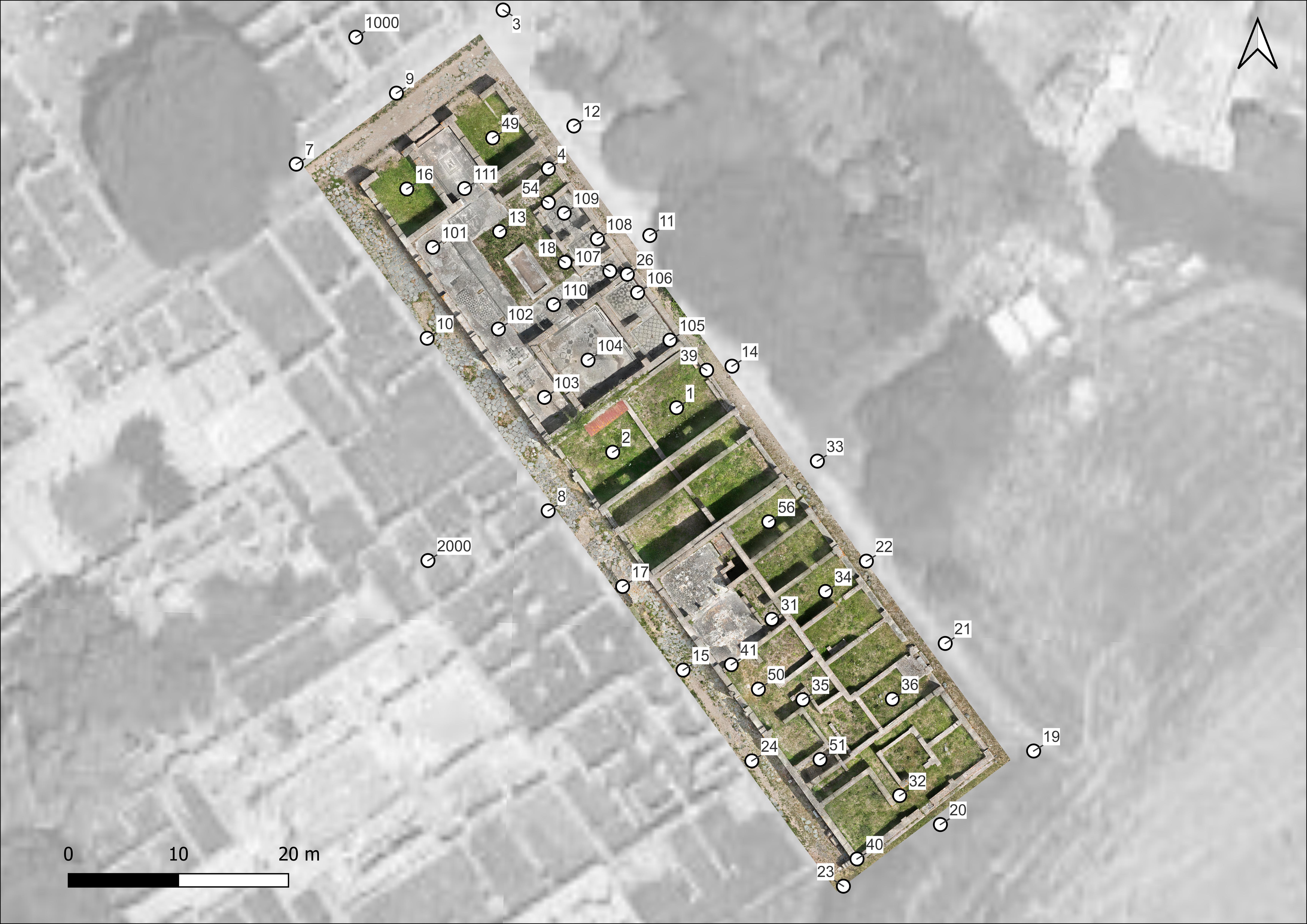 In July 2023 a 3D survey was carried out on the whole block V, III (Figure. 3). The aim was to complete the data produced by Martina Marano's research on the reconstruction of the phases of the architectural complex from the Late Republican period to Late Antiquity. The topographical survey presented several challenges and required careful consideration of the techniques to be used. Due to the limited time available for the survey, the extensive surface of almost 1,200m² and the planimetric complexity of the site, as well as the height of some of the walls, it was not possible to rely solely on a terrestrial laser scanner (TLS). To cover the entire area and produce high-quality orthophotos of the buildings and some elevations, we combined photogrammetric UAS surveys with TLS. This approach is at present very widespread since it offers several advantages, including the ability to survey areas inaccessible to TLS and to obtain a superior quality of the textures used in the final 3D model and orthophotos, particularly for the elevations. However, using both technologies also results in a longer survey phase; to better plan the field operations, we drew on many studies published in recent years on methods to merge the data produced by these two technologies (Chatzistamatis et al. 2018; Kompoti et al. 2023; Chandler and Buckley 2016; Jo and Hong 2019; Dawn and Biswas 2019; Angelini 2013). The survey operations were limited due to constraints imposed by the Ostia Archaeological Park, such as the presence of visitors, and the proximity of the Roma Fiumicino airport. Surveys were only conducted on Mondays when the park was closed and at a maximal altitude of 25m a.g.l. The south-eastern part of the complex was exclusively surveyed using UAS, providing an overall view of block V, III with two levels of accuracy while respecting time constraints. The use of drones for photogrammetric surveying provides a faster alternative to ground-based TLS, albeit with reduced accuracy (Chandler and Buckley 2016). The general workflow of the field operations (Figure. 4) includes survey planning for TLS (location and number of stations) and UAS (flight plan and location of GCPs), data acquisition, and data processing, final model production and data archiving. The first step was to establish and georeference the ground control points (GCPs), to be used for both surveys to ensure a seamless integration of the point clouds produced by the TLS and the UAS. A total of forty-eight markers within and around the block, along four main northeast-southeast lines were placed (Figure. 5). As far as possible, at least one marker in each room of the architectural complex was placed. Markers were also placed on certain walls ridges to correct vertical errors. The markers were georeferenced in the reference system of the archaeological park, Monte Mario/Italy Zone 2 (EPSG:3004), using a Topcon HiPer HR GNSS rover, paired with a Topcon HiPer HR base that was located on the park's topographic benchmark of the Fullonica at the intersection of Via degli Augustali and Via della Fortuna Annonaria.