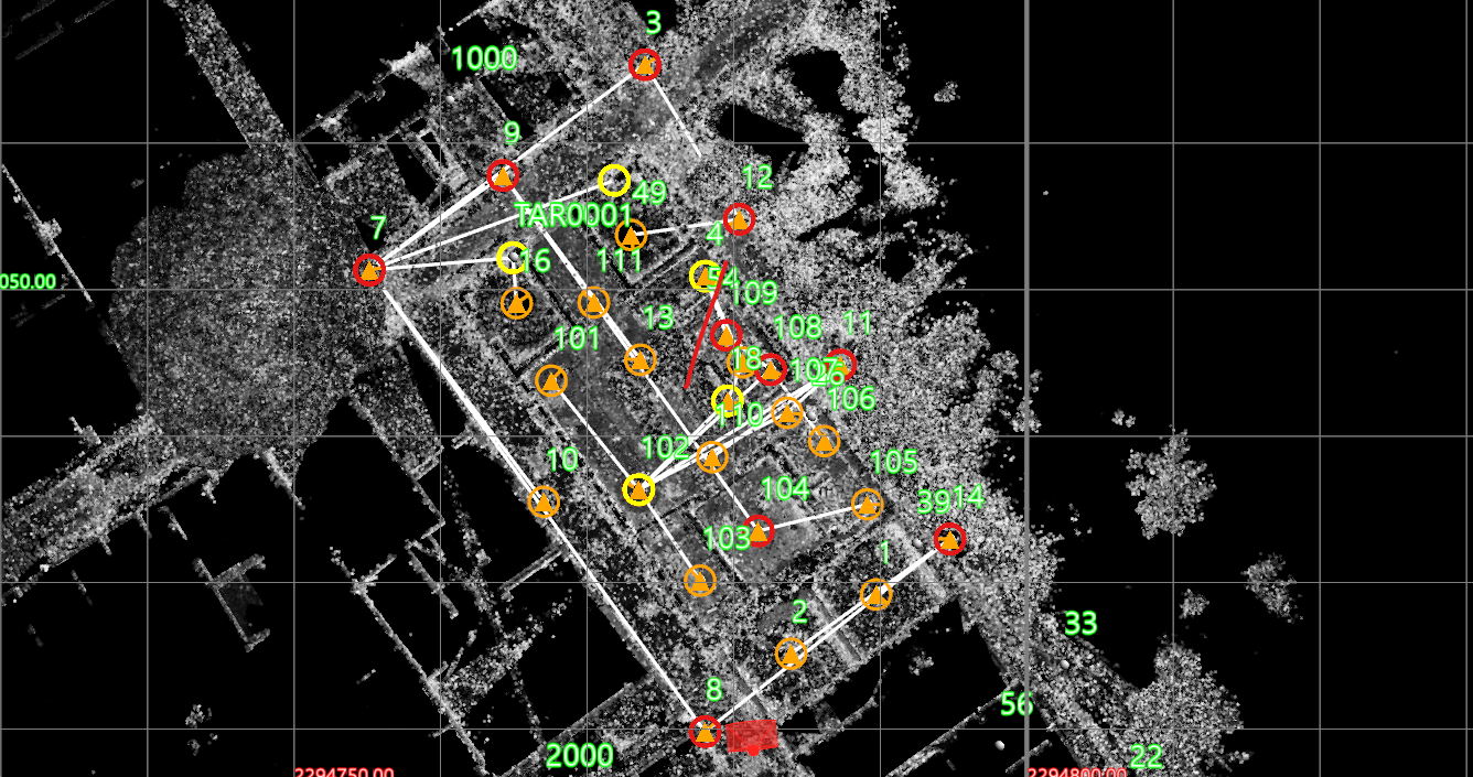 The TLS Topcon GLS-2200 laser scanner was used for the Caseggiato dei Lottatori due to its topographical approach. For each scan, a station is set up at a specific point (Occupation Point) and its coordinates are checked by measuring the distance from another station (Backsight Point). In this way, scans are natively georeferenced, which improves survey accuracy and simplifies operations when there are visual obstacles between each scan, as in the present case. Moreover, it is not essential to achieve the same degree of overlap as with a conventional TLS, which relies on markers and matching with surrounding scans for alignment (Ebolese, Lo Brutto, and Dardanelli 2019). To improve measurement accuracy, a stationary tripod with a 360° prism was positioned on a backsight point outside the building to avoid any unwanted elements within the scan. The tripod was only relocated when the prism was no longer visible to the laser scanner. Although this method may result in slightly higher error than using a traverse, it allows faster surveying in the field. Due to the complexity of the site, including its size, numerous obstacles, and small dimensions of certain spaces, we had to improve survey coverage of difficult areas by adding several minor scans. This required two days of TLS scanning. The first day was dedicated to the main scans, while the second day focused on more complex areas. In total, twenty-seven stations were established in and around the Caseggiato (Figure. 6). The scans were taken at a resolution of 3.1mm, at a distance of 10m, with a full-dome field of view (360° horizontal and 270° vertical). The resolution level was chosen based on the smallest element to be scanned, which in this case were the mosaic tesserae and the joints between them (Historic England 2018, 29-30). Thanks to its active approach, TLS still has an advantage over photogrammetry in terms of accuracy. As Jim Chandler and Simon Buckley point out in a comparative study of the two techniques, TLS offers advantages in terms of accuracy, repeatability and reliability, and can still be viewed as the gold standard for 3D measurement (Chandler, and Buckley 2016, 3). Many recent devices, including the model used in our study, incorporate HDR cameras to colourise the point cloud. However, the quality of these images is often average. To overcome this limitation, it is possible to merge the point cloud generated by a TLS with the texture produced by photogrammetry. This results in a significantly higher quality of the 3D model