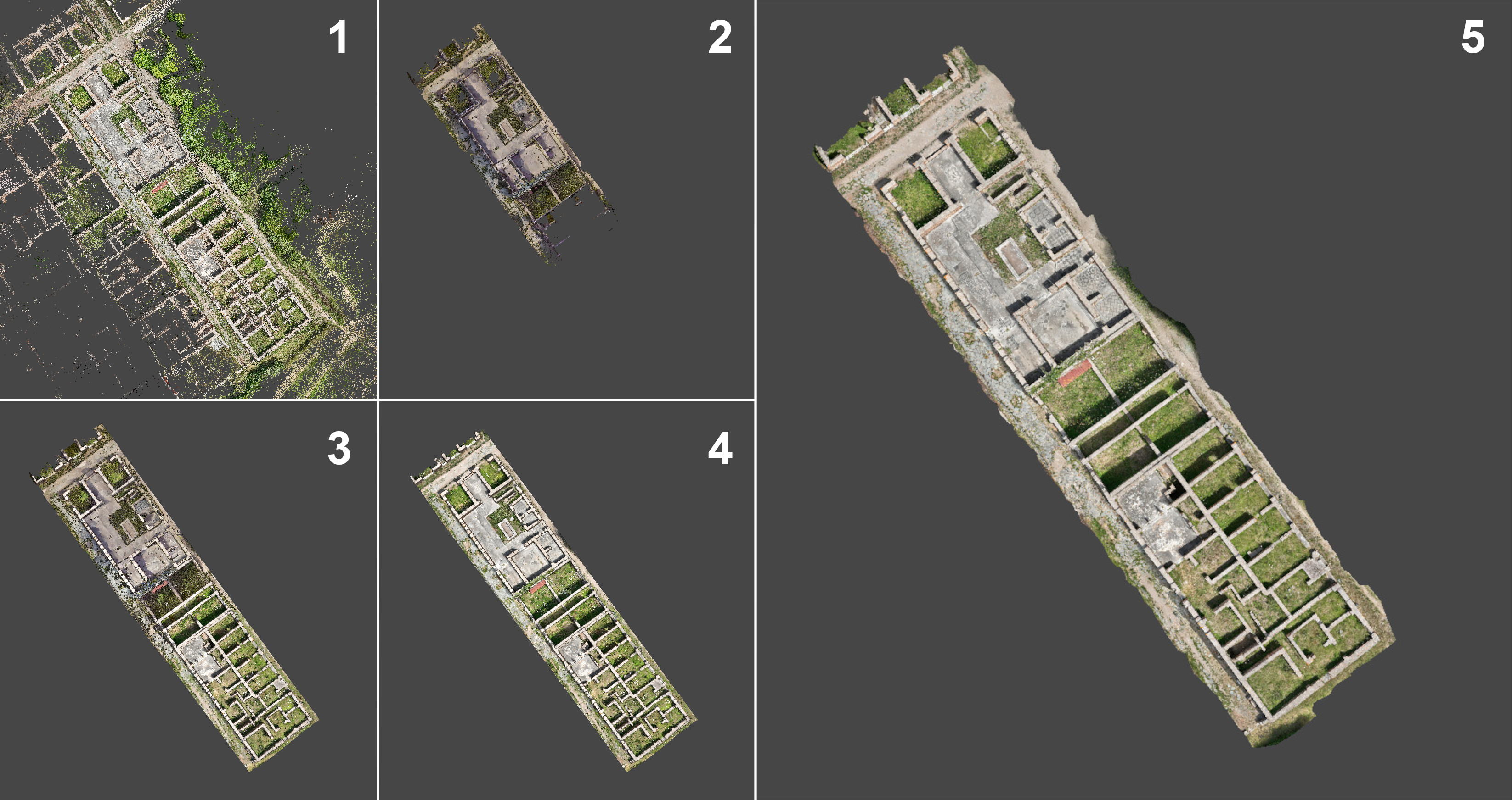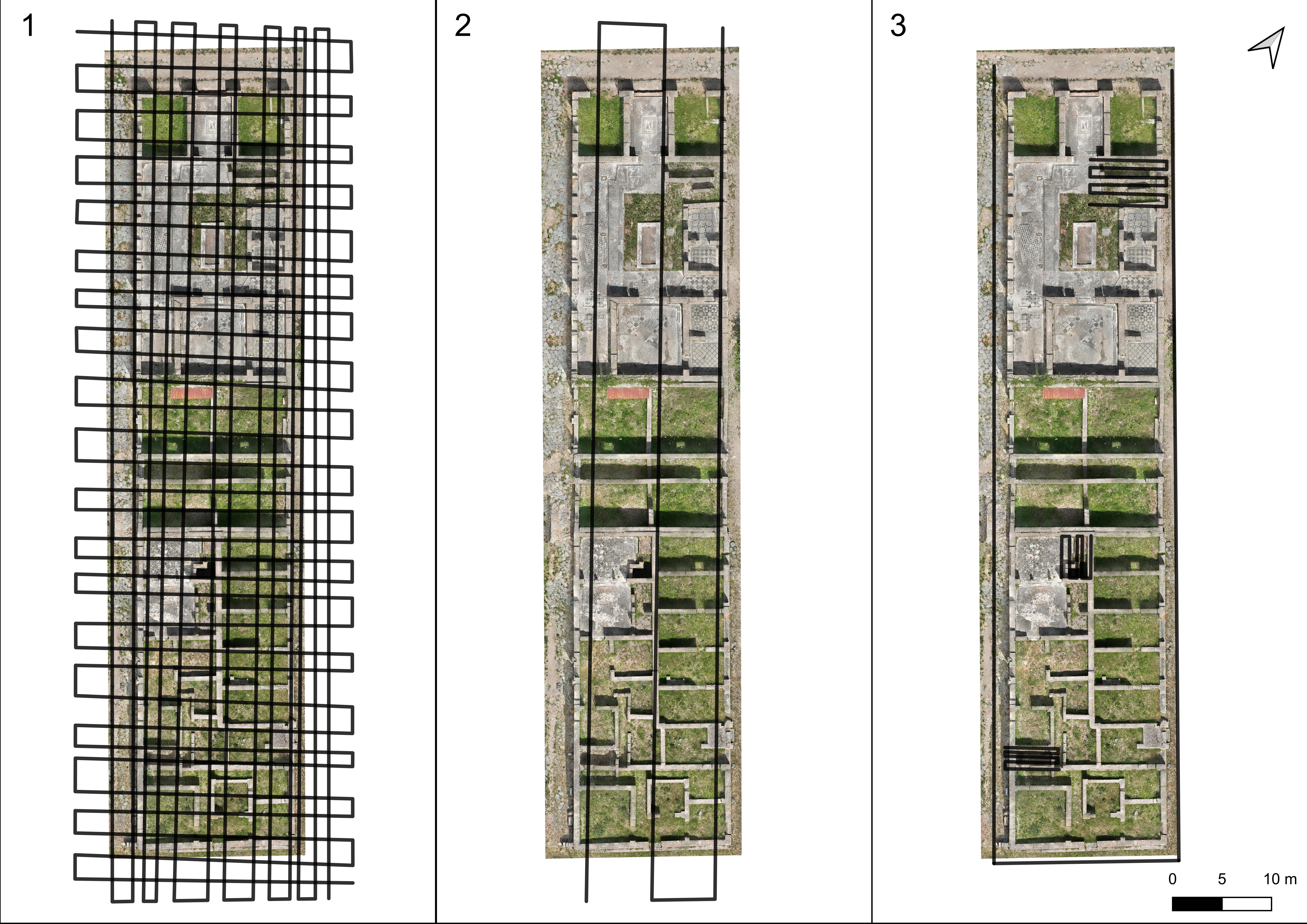 A DJI Mavic 3 device was used to acquire aerial photogrammetric data (Historic England 2017; Remondino et al. 2014; Bianco, Ciocca, and Marelli 2018) due to its affordability and ability to produce high-quality photos. The drone's weight of 895g, the 46-minute battery lifetime, the three-axis stabilised gimbal, and the high-quality 4/3 sensor camera with 20mpx and ND filter compatibility make it an ideal choice for photogrammetry. Additionally, a recent software update allows for semi-automated flight planning1. However, unlike other drones such as the DJI Matrice 300 or DJI Mavic 3 Enterprise RTK, this model does not have Real Time Kinematic (RTK) support for more accurate geolocation, which makes it essential to use GCPs distributed throughout the survey area to significantly reduce errors (Troner et al. 2020; Forlani et al. 2018; Gerke and Przybilla 2016). To reach the desired level of detail and quality, three flights were necessary to cover the entire area. The presence of obstacles such as vegetation and other buildings, as well as the size of certain rooms, made it impossible to obtain sufficient coverage using a conventional flight plan. Therefore, the following three flights were carried out (Figure. 7): north-south and east-west grids at an altitude of 8m with a camera angle of approximately 45° to cover all the structures and their elevations; north-south parallel lines, with a zenith viewing angle, to survey floors and wall bases; a detailed survey of the external elevations and the smallest rooms, which required additional photos. As a result, a total of 1116 images were taken to cover the entire area uniformly, for a total flight time of 75 minutes. For all three series, the camera had a fixed aperture of f/8 and an ISO value of 100, while the shutter speed was variable, to ensure the best possible sharpness for all images. Thanks to these parameters and the flight altitude, a ground sample distance (GSD) of 2.8 mm per pixel was achieved. Data Processing The cloud points were firstly edited separately before being merged to create the final 3D model (Figure. 8). After transferring all the georeferenced scans from the TLS to the Magnet Collage software, the registration accuracy of each scan was checked using the Root Mean Square (RMS) value produced. To reduce the RMS value resulting from a significant vertical error, a cloud-to-cloud registration based on the Iterative Closest Point (ICP) algorithm was applied (Besl and McKay 1992; Rajendra et al. 2014). The lowest vertical error station was selected as the reference, resulting in an RMS resolution of 0.0162m. The 27 scans were exported in PLY format for cleaning operations using Cloud Compare software. The scans were manually cleaned to remove unwanted elements such as tripods and prisms placed on reference points, and they were merged into a point cloud containing over 427 million points. The number of points was reduced to 295 million points after cropping to the study area, refining the cleaning process by removing the last unnecessary elements such as surrounding vegetation, and applying the duplicate point removal and SOR (Statistical Outlier Removal) filters. For the photogrammetric processing of the UAS photographs, Agisoft Metashape Pro software was used. This software can process various types of data, including aerial, satellite, multispectral, and thermal photographs, as well as TLS scans (since version 2.0) (Papoutsaki et al. 2023, 150). The images were aligned according to their GPS position recorded in their EXIF data, and a sparse point cloud of over 2 million tie points was generated, which were accurately positioned in the EPSG:3004 coordinate system using markers. A dense point cloud of almost 76 million points was generated, which was then filtered and cleaned using Cloud Compare, resulting in 49 million points remaining. The two cleaned point clouds from TLS and UAS were re-imported into Agisoft Metashape Pro and then merged to produce the 3D model (mesh) with a root mean square (RMS) error of 0.01m. The model was then textured using UAS photographs.