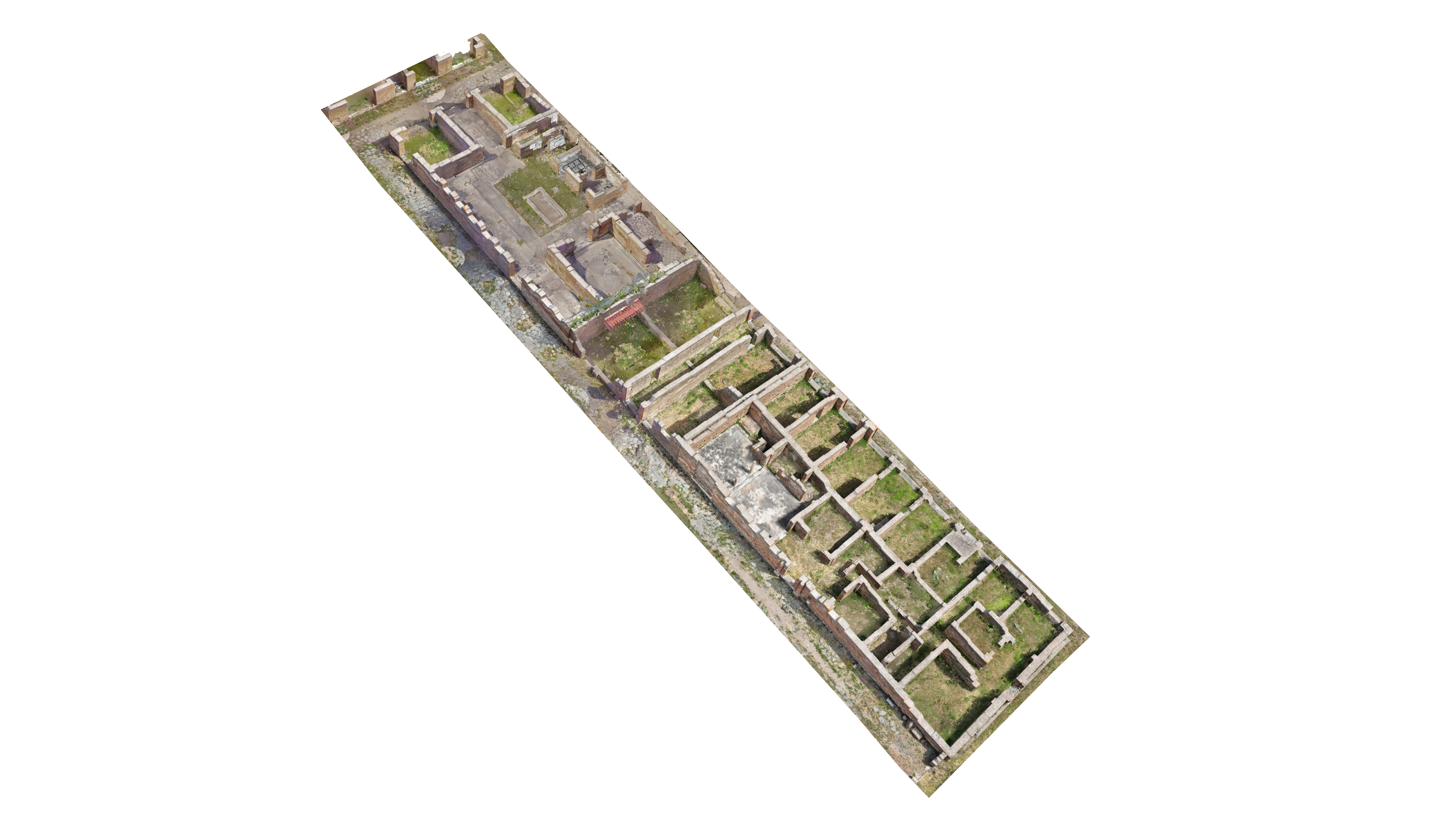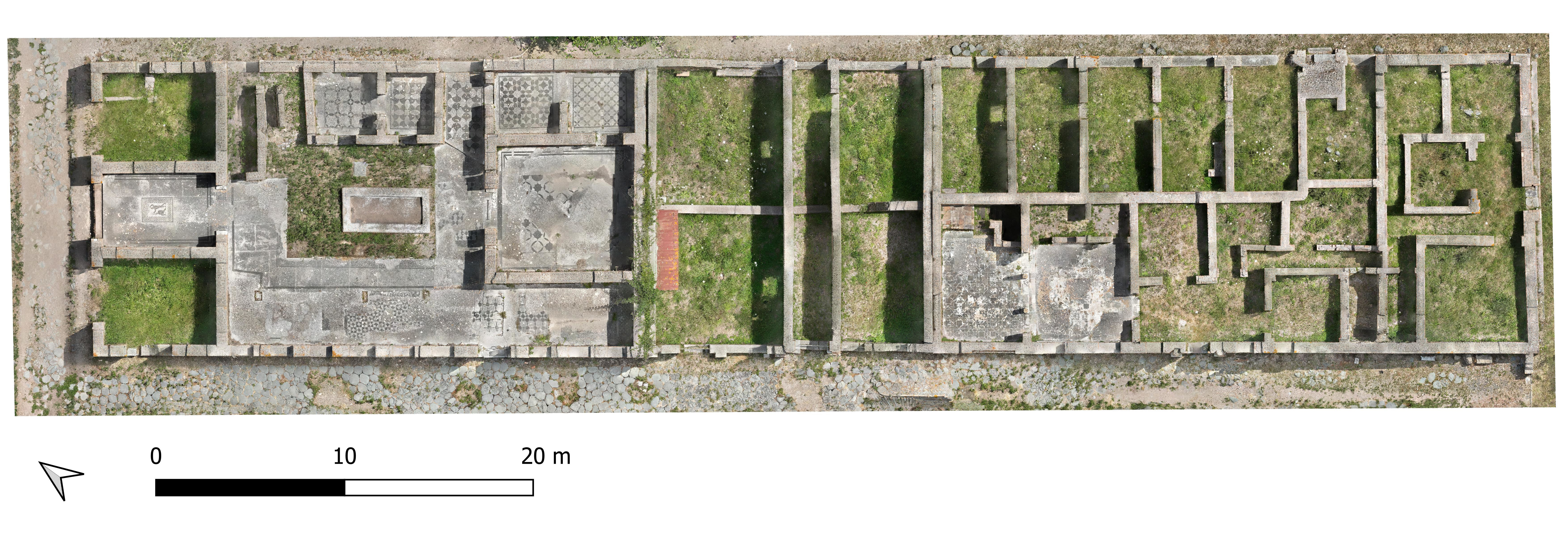 The survey of block V, III in Ostia has resulted in a high-resolution, textured 3D model by combining TLS, UAS, and GNSS data (Figure. 9). It allows the export of detailed images and facilitates the acquisition of new data, particularly in terms of measurements. To analyse the various phases of the architectural complex and its modern restorations, which can be distinguished using different materials, horizontal projections were also required. Agisoft Metashape was used to produce zenith orthophotographs (Figure. 10) and views of each external wall, correcting for any distortion caused by the photographic sensors. The high-quality and numerous photographs taken by the UAS from various angles enabled us to create high-definition orthophotographs. These images can be used in the future to produce plans of the different phases of the structures and their prospections.