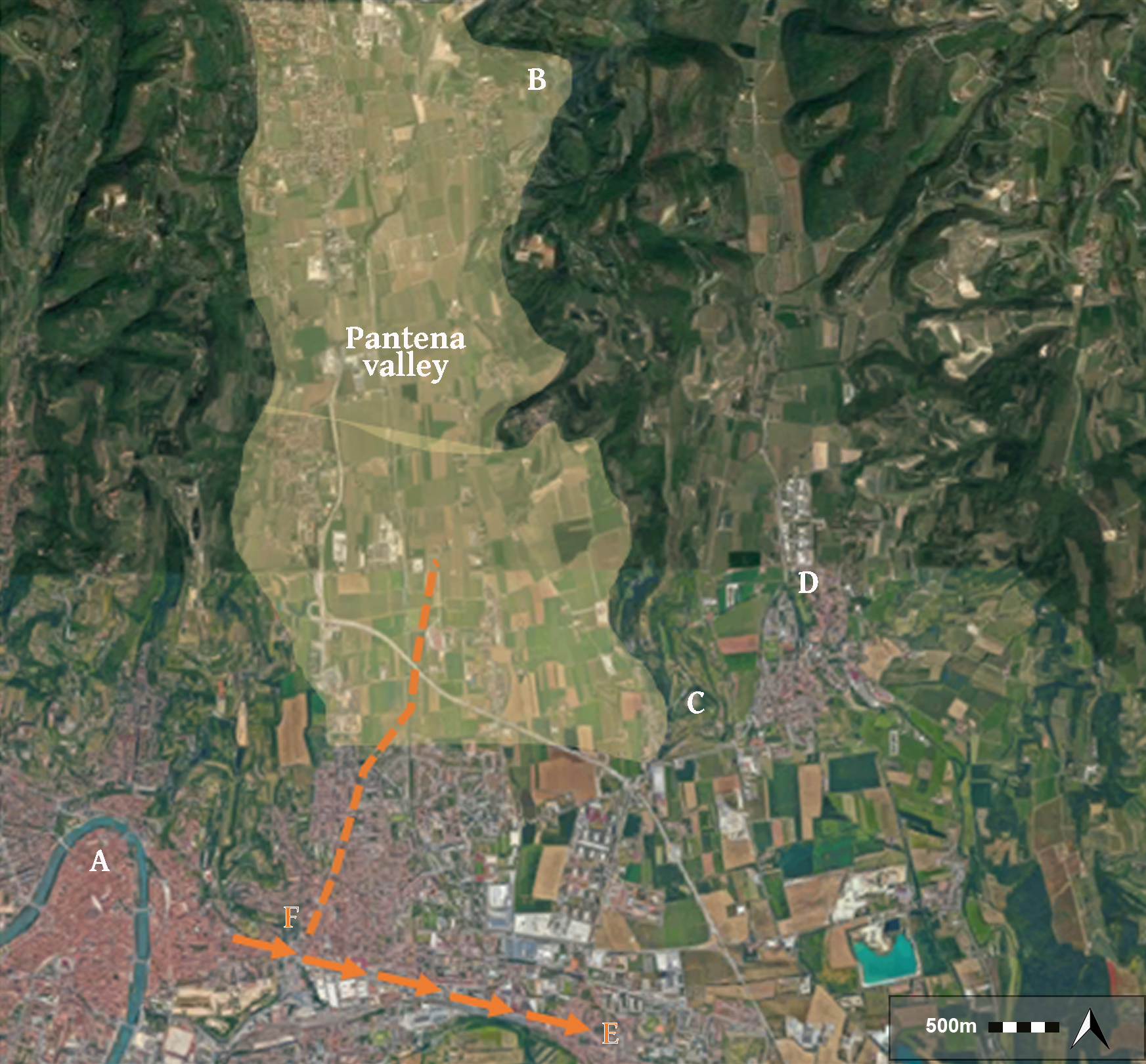 Figure 1 - Map of the surveyed area: A: Verona; B: S. Maria in Stelle; C: Montorio Castle; D: Montorio; E:Via Postumia; F: branch of the Via Postumia , probably leading to the Pantena valley (elab. by the author; map data: © Google Earth). -