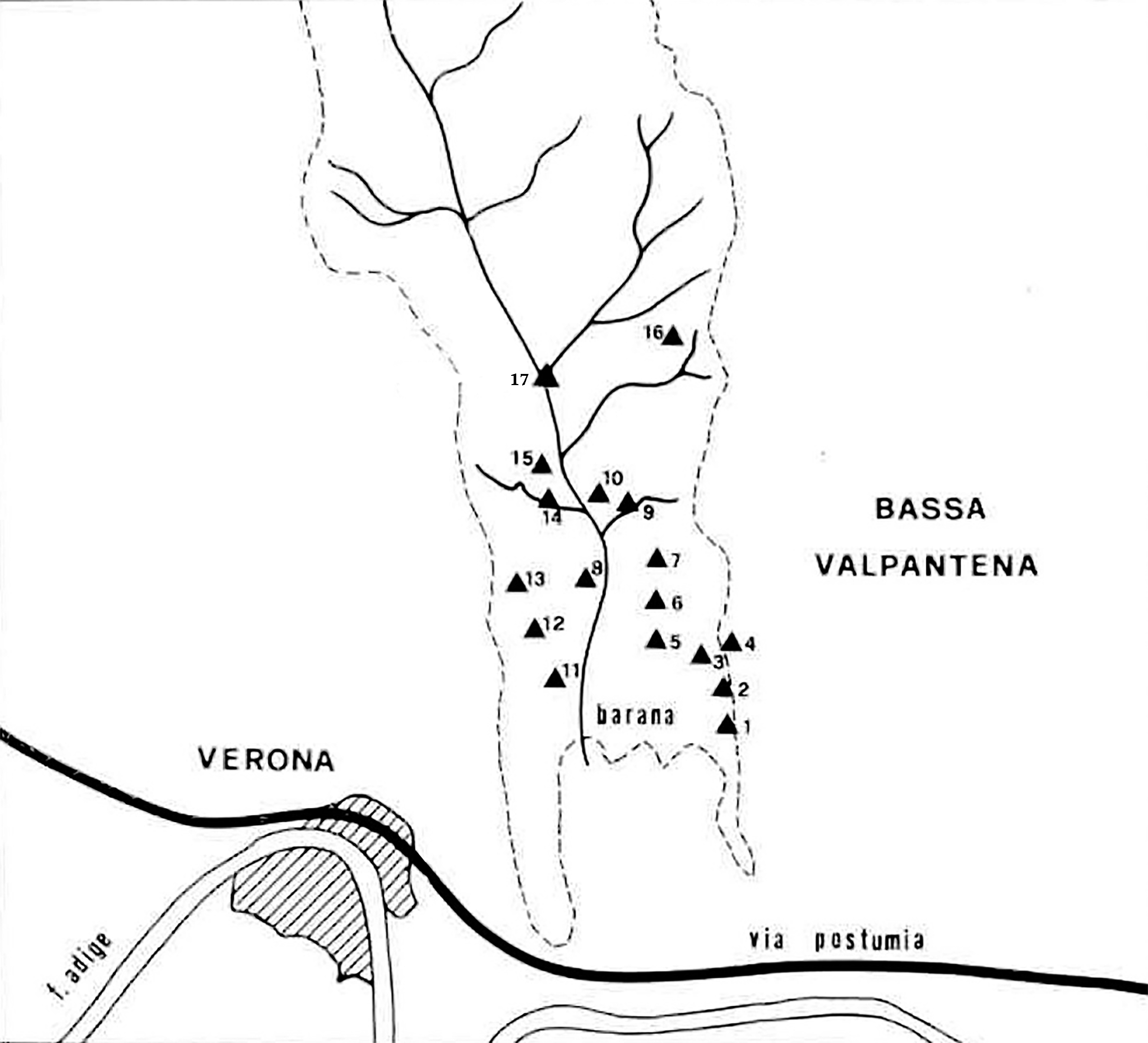 Figure 3 - Sites within the Pantena valley where evidence from the Roman period has been discovered: 1. Montorio Castle, 2. Gazzol (villa Balladoro), 3. Novaglie, 4. Pipaldolo, 5. Nesente, 6. Vendri, 7. Santa Maria in Stelle, 8. Cassiano, 9. Sezano, 10. Cellore di Sezana, 11. Poiano, 12. Palesago, 13. Quinto, 14. Marzana, 15. Cuzzano, 16. Romagnano, 17. Grezzana (adapted from Franzoni 1991: 87). -