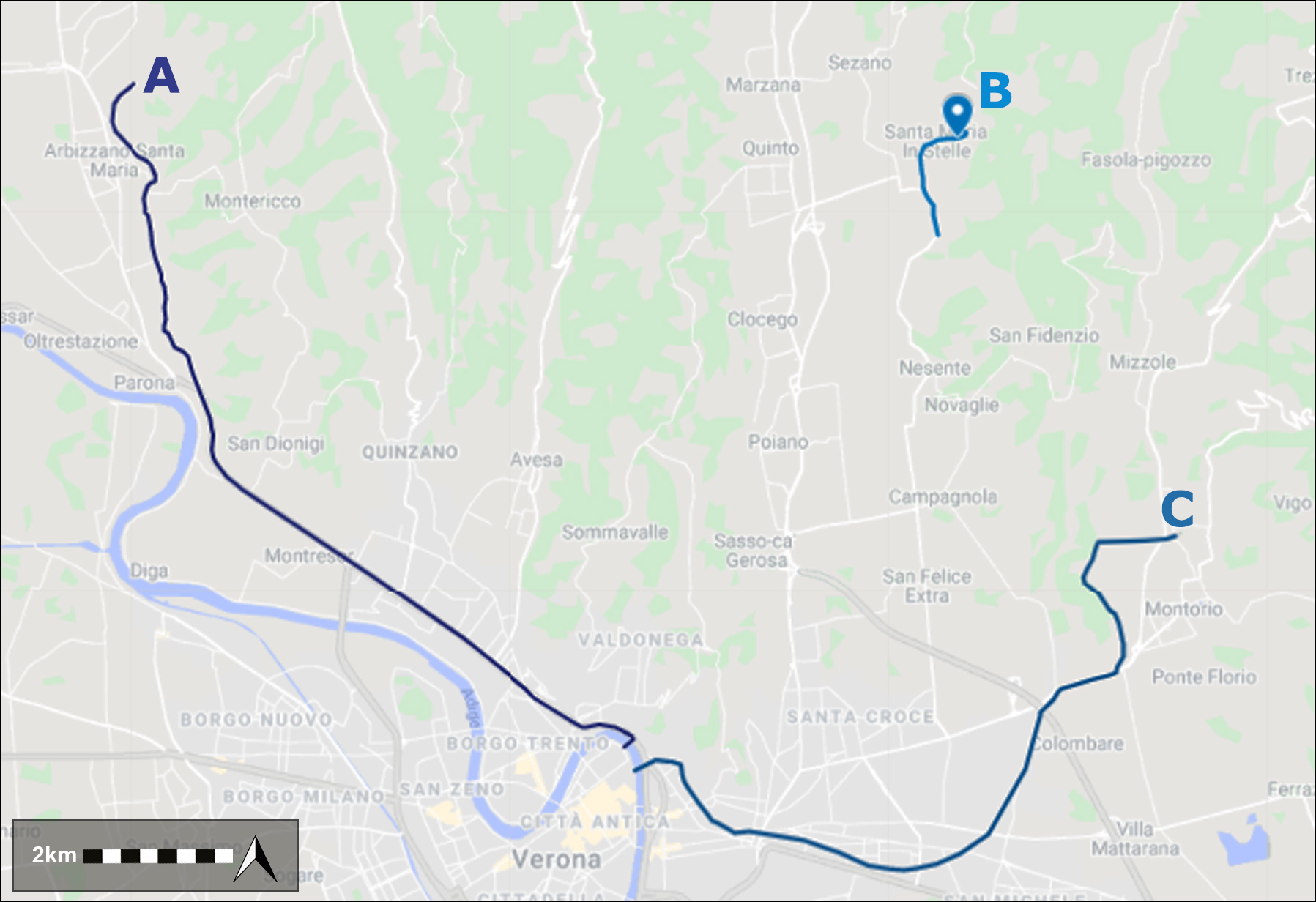Figure 4 - The aqueducts in the surroundings of Verona: A: the aqueduct of Novare-Parona; B: the aqueduct of Santa Maria in Stelle; C: the aqueduct of Montorio (elab. by the author; map data: © Google My Maps). -