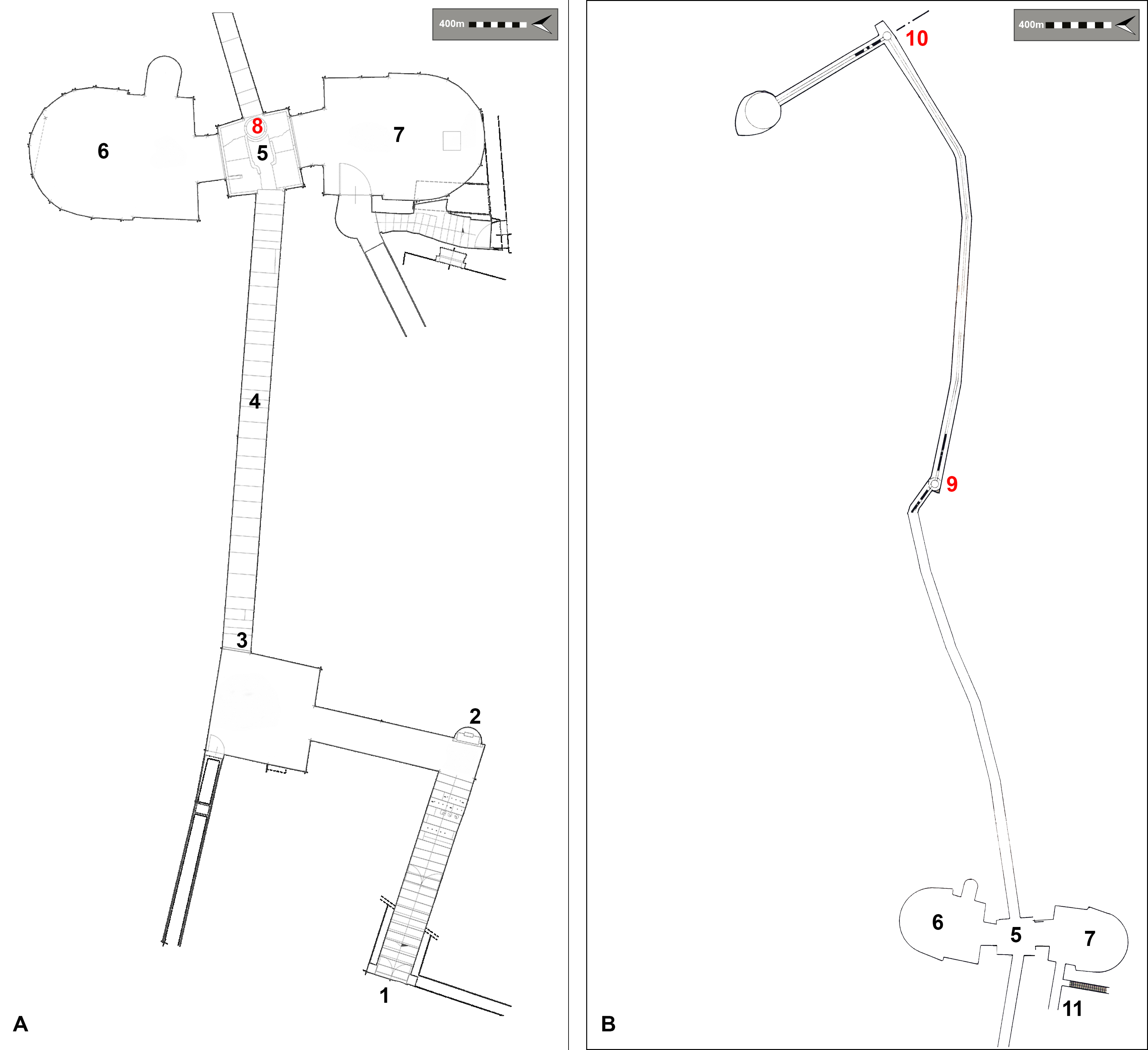 Figure 5 - The plan of the hypogean area (A-B), dropshafts are indicated in red: 1. current entrance, 2. statue of Cornelianus, 3. inscription, 4. first corridor, 5. connecting chamber, 6. northern apse, 7. southern apse, 8. previous location of the inscription (15th century CE), 9. dropshaft, 10. dropshaft, 11. entrance in use since at least in 15th century CE and perhaps earlier (adapted from Gangale Risoleo 2018: 272, fig. 6; 275, fig. 8). -
