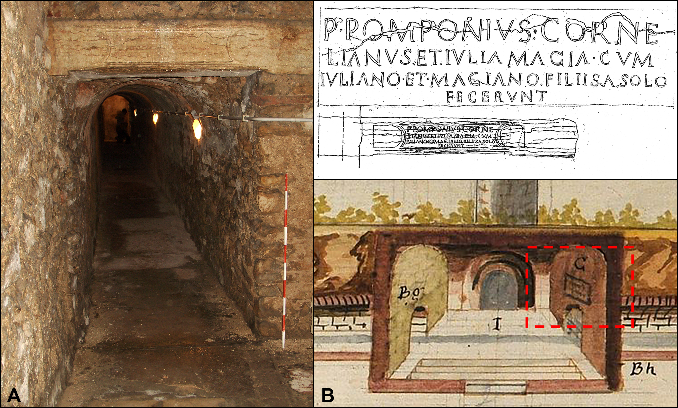 Figure 6 - The inscription inside the hypogeum: A. the current position (photo by L. Marino); B. the original position in a drawing from the end of 18th century CE, marked with letter C (BCVR, ms. 1002, c. 1r., detail). -