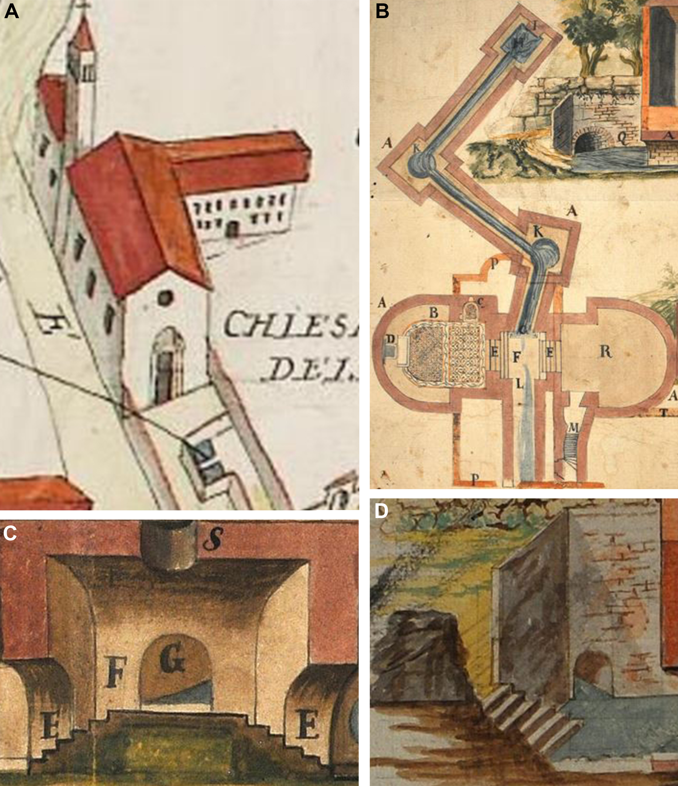 Figure 7 - A series of 18th century CE drawings that allow us to reconstruct certain features of the monument that are now lost: A. details of the presence of a basin at the current entrance to the hypogeum (ASVR, Campagna famiglia, mappe e disegni, 337, concession to publish n. 17/2024); B: the absence of a pavement along the water channel (BCVR, ms 1002, 2r, detail); C: the presence of a staircase that allowed access to the last dropshaft located between the two apses (BCVR, ms 1002, 2r, detail); D: the presence of some steps at the basin located at the current entrance to the hypogeum (BCVR, ms 1002, 4r, detail) (all pictures elab. by the author). -