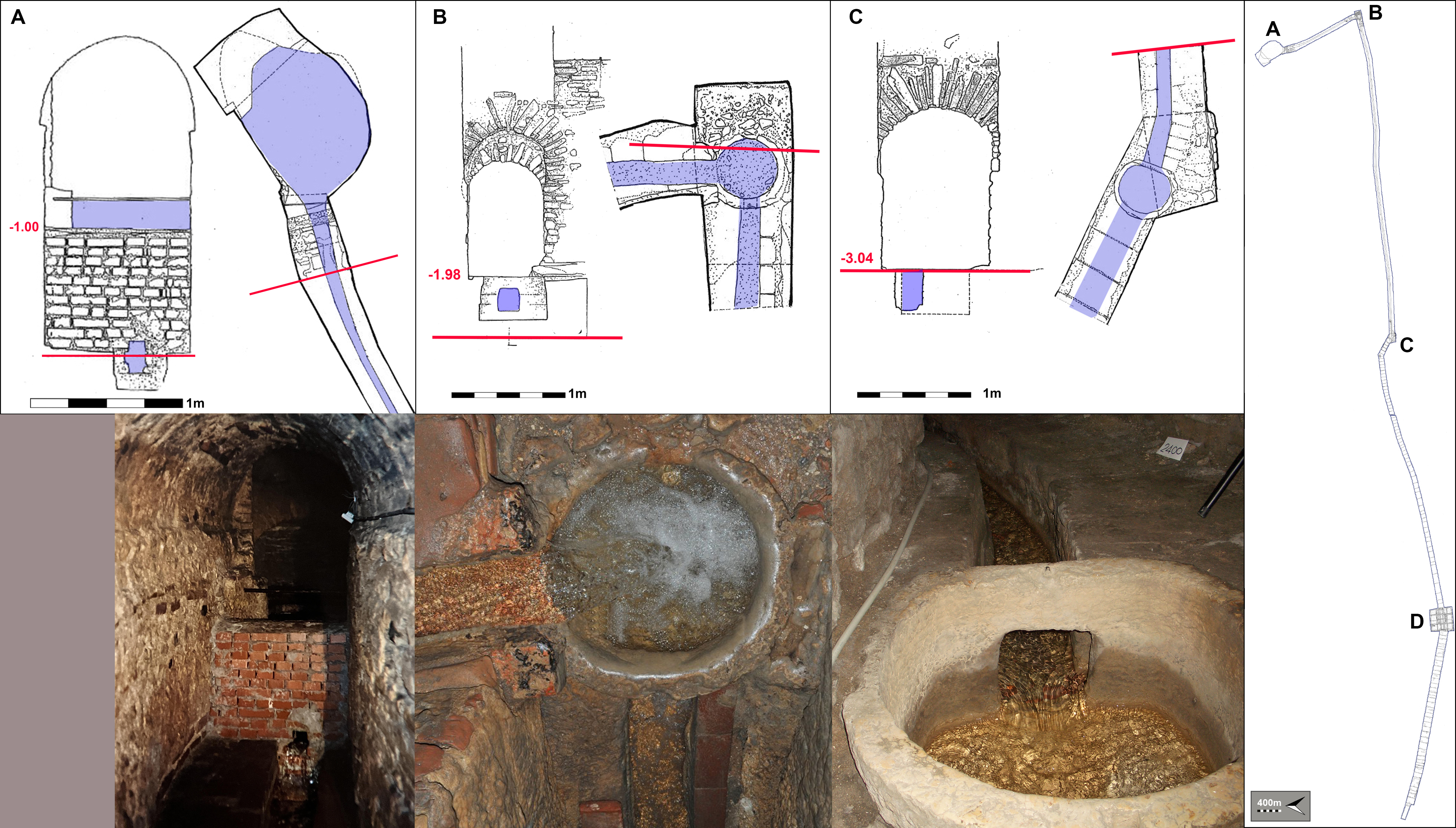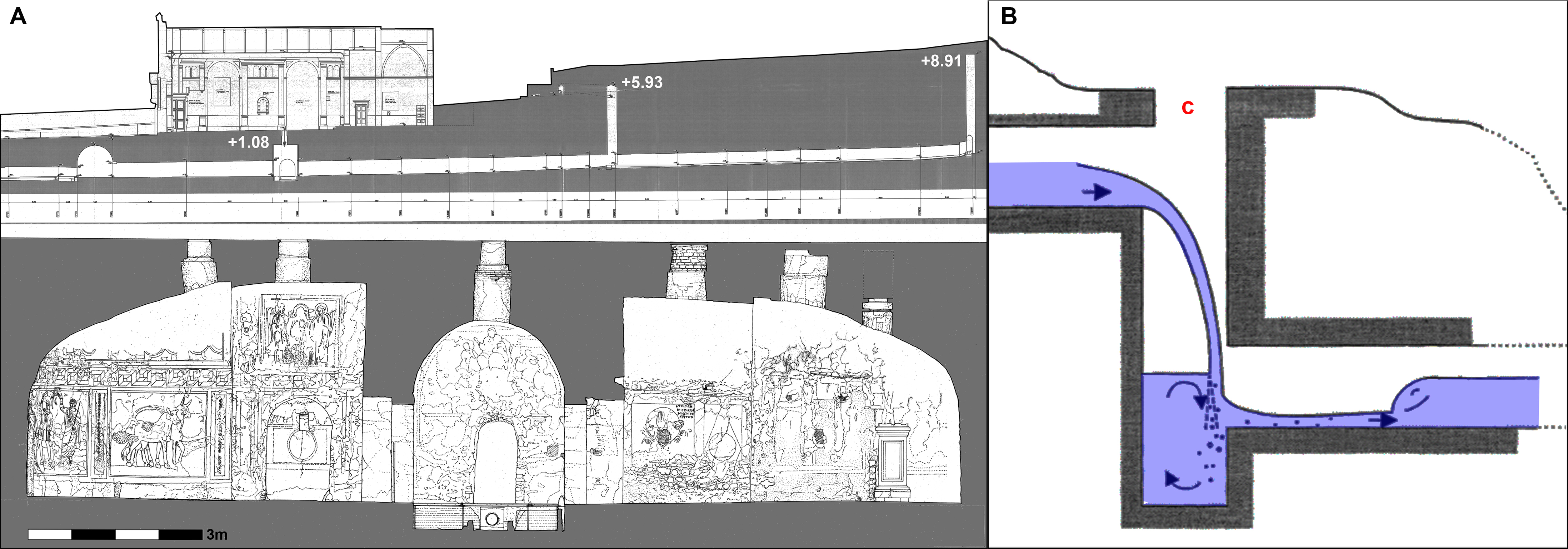 So far, we can distinguish the different phases of construction of the complex, the first of which (Linington and Falamaki 1970, 83 84) was part of a water supply system. After this phase, the northern apses (Fig. 5, 6) were built first, cut into the rock, while the southern apses (Fig. 5, 7) were partly cut and partly built (Linington and Falamaki 1970, 83). This means that the water channel was built against a cliff (Gangale Risoleo 2018, 274 275). However, the hydraulic function of the complex seems never to have been interrupted, because even when the complex became a place of worship, new solutions were found to keep the water flowing: a side access (Fig. 5, 11) (Gangale Risoleo 2018, 274-275) that did not interfere with the channel and some steps to overcome it were built at the point of passage between the two apsidal rooms (Fig. 7, C). However, we do not know whether the water had a function within the ritual practices or whether it was used only for civil purposes. It is also doubtful that the hypogeum ever had a funerary function (David and Maccani 2007, 16; Gangale Risoleo 2018, 274-275), as this would be difficult to reconcile with the passage of fresh water. The funerary inscription of Pomponia Aristoclia8 (CIL V, 3706) was probably placed in the hypogeum later. The identification of the different building phases is a key point for understanding the complex transformations and, above all, its original phase when it was not a place to receive the faithful, but a service passageway for the management and maintenance of the water supply system. The aqueduct, in this first part, is characterised by the presence of three dropshaft cascades (Figure. 8) (Chanson 2000, 56-67, 69-70)9, located at the intersections of the blueprint, and we have assumed the presence of a fourth basin, perhaps a reservoir (piscina limaria?), at the modern entrance (Fig. 7, A and D). There are three stone basins associated with the dropshaft cascades, probably installed to allow the water to decant and scatter the debris transported along its course (Gangale Risoleo 2018, 270-271). This hypothesis seems to be confirmed by a note from 18th century CE10 which mentions the presence of a large amount of gravel at the supposed reservoir and inside the channel, which caused the flow to slow down. The same circumstance is reported by Giovanni Battista Pighi at the beginning of the 20th century CE (Pighi 1903, 15), who testifies that in the 18th century the channel had to be reclaimed by raising the upstream section. Furthermore, in 1818 (Pighi 1903, 16), a flood swept a lot of debris downstream, destroying the walls of the basin at the entrance to the hypogeum and filling it up to its source. The water, unable to find an outlet, flooded the church above. The basins at the dropshafts and the reservoir may have had the same function (Fig. 8), allowing the debris to settle to the bottom. At the same time, the dropshafts controlled the flow of water: the water goes from an altitude of -1m to -4.13m over about 130m, giving a slope of 2.4%11 (Pace 2010, 18 21). It is possible, however, that the gradient was greater and that the current geometry is the result of modern works carried out with the aim of reducing the slope and avoiding possible flooding inside the channel. The first two basins at the dropshafts have a very simple configuration (Fig. 8, B and C): a stone basin with an outlet hole, the bottom of which is at a lower level than the supply channel at the edge of the basin. This configuration was modified in the second basin (Fig. 8, C). Here, in modern times, a pavement has been built so that the water flows underneath it, thus varying the height of the incoming and outgoing water in relation to the settling basin. A third basin is in the atrium between the two apsidal rooms (Fig. 8, D; Figure. 9, A and B). The basins were probably made of stone to prevent erosion caused by the acceleration of the water flow due to the presence of the dropshafts (Chanson 2000, 59, 67, fig. 18). This basin is currently covered by a metal grating (Fig. 9, B), and it is not possible to determine its correct height in relation to the two apsidal rooms. It is at -0.50 m above sea level, while the stone slabs placed laterally are at -0.35/-0.40 m above the level of the hypogeum (-4.00/-4.14 m above sea level). It was intercepted during the laying of a fibre-cement pipe in 195712 (Franzoni 1991, 101; Gangale Risoleo 2018, 269, fig. 4), but has certainly been affected by the various restorations carried out in the hypogeum. The presence of a staircase was previously reconstructed here, but it no longer exists. It was discovered in 197213 (Franzoni 1991, 101) during some investigations carried out by the former Soprintendenza Archeologica of Padua. Franzoni proposed that it was reconstructed like the other two basins at the dropshafts but is also composed of a rectangular part that framed the circular one, narrowing slightly to the size of the water channel. The lack of evidence does not allow a precise reconstruction. The morphology seems to be different from the others, but it is difficult to determine whether these differences are decorative or otherwise functional14. One hypothesis is that it contained a filtering system that has now been lost15; however, a ritual function cannot be ruled out. Dropshafts are often associated with the presence of inspection manholes (Figure. 10, C); perhaps because they are recognised as sensitive points within the channel, requiring careful inspection and frequent maintenance (Zanovello 1997, 668). Ancient sources recommend that they should be located every ca. 35m16 (Sherwood, et al. 2020, 348, 350). It is likely that they were built during the construction phases of the specus, to orient the underground excavation during construction, and to allow air circulation as well (Mari 1991, 165; Tölle-Kastenbein 1993, 109-111). In the hypogeum, these are all arranged according to the basins (Fig. 10, 