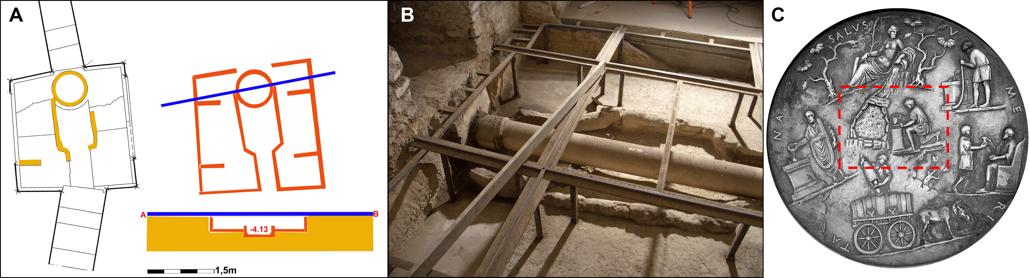 Figure 9 - The third dropshaft located between the apses and its comparison with a water basin depicted in the so-called ‘pátera de Otañes’: A: plan of the dropshaft (adapted from Gangale Risoleo 2018: 272, fig. 6); B: photo of the dropshaft (photo by L. Marino); C: patera de Otañes (adapted from Iglesias Gil and Ruiz Gutierrez 2012: 351, fig. 2). -