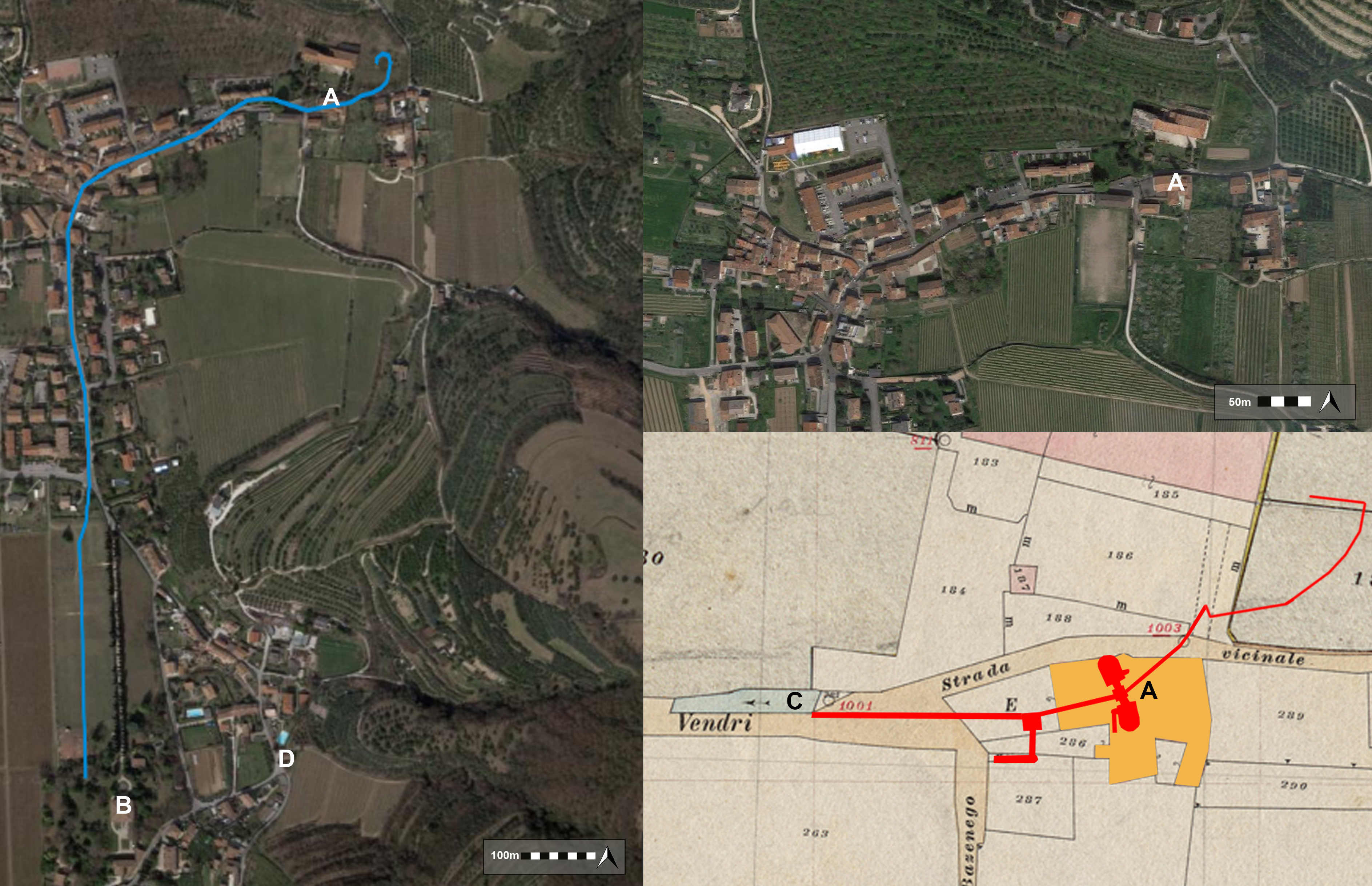 Figure 11 - The aqueduct of Santa Maria in Stelle from the church (A) to the villa Giusti-Puttini in Vendri (B), the public washhouse (C), and the church of San Zeno in Vendri (D) (elab by the author; map data: © Google Earth). -