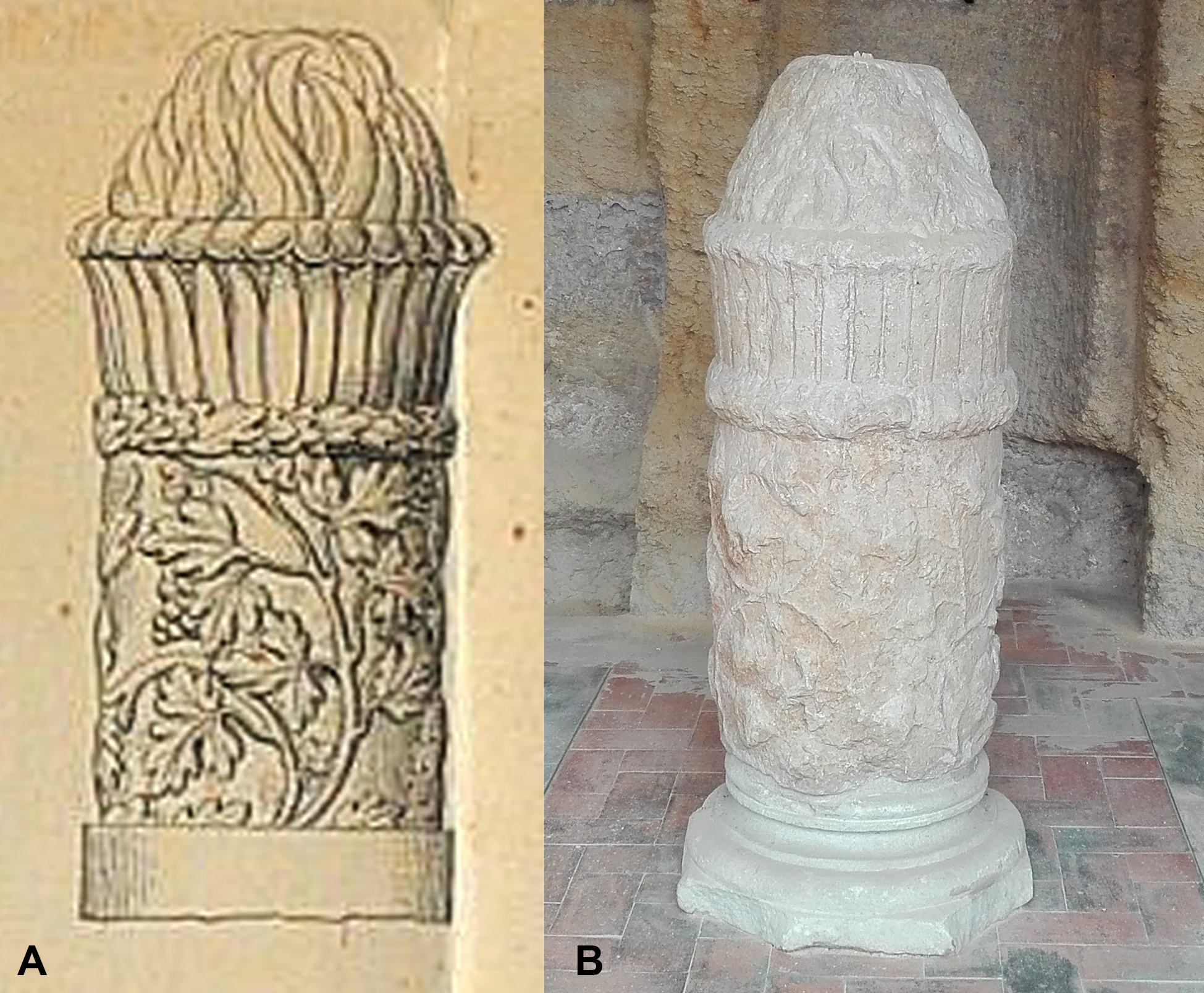 Figure 12 - The anepigraphic cylindrical altar found at Santa Maria in Stelle: A: a drawing from the 19th century (adapted from Orti Manara 1848, table II, n. 9); B: a photograph of the altar inside the Museo Archeologico al Teatro Romano di Verona (photo by the author).
