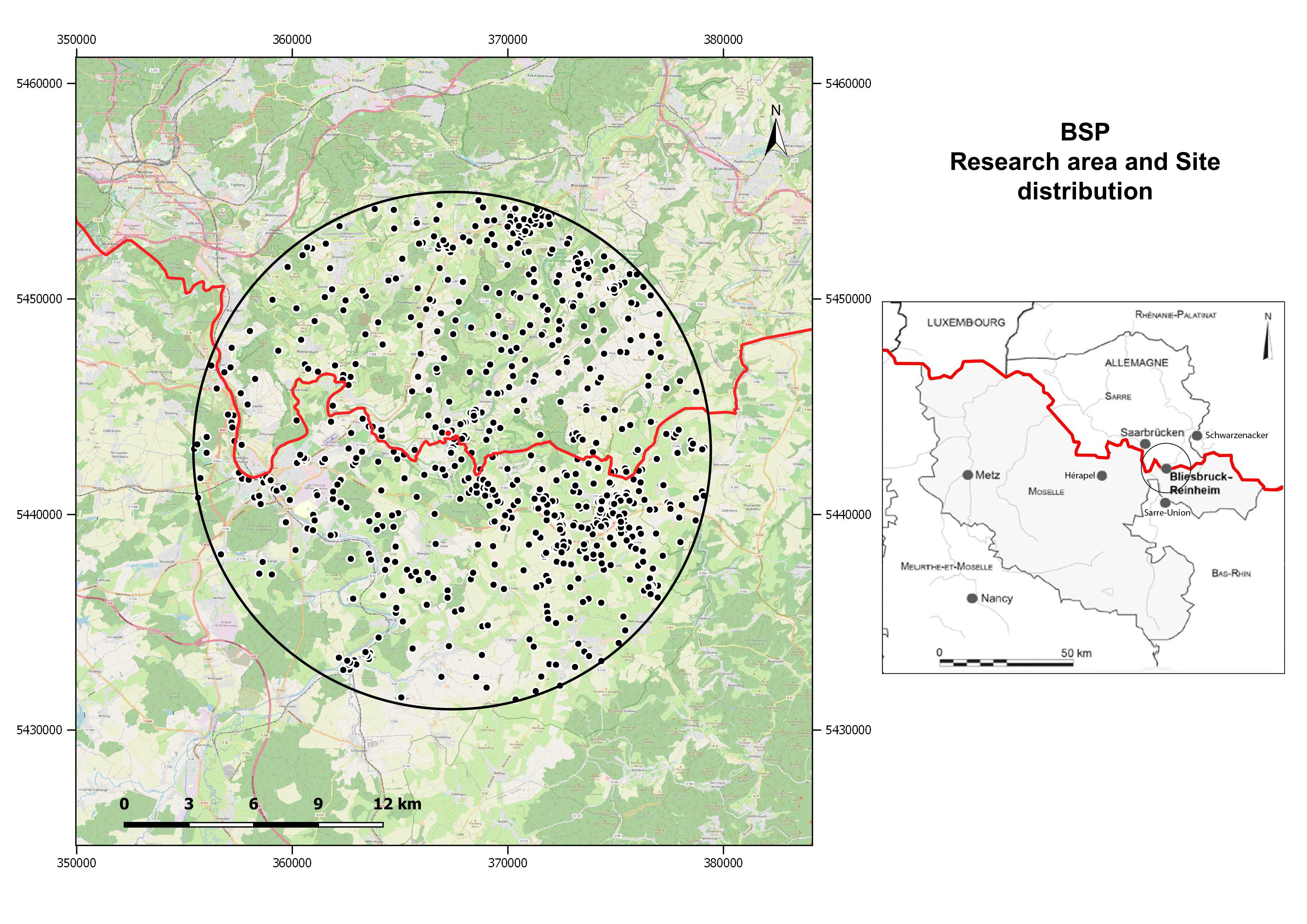 Blies Survey Project (BSP) is an international cross-border research project aimed at reconstructing the historical landscapes around the ancient settlement of Bliesbruck-Reinheim, within a radius of 12 km. The research project is focused on a region located between the eastern part of the Moselle department in France and the southern part of Saarland in Germany, between two river valleys (namely the Blies and the Sarre) characterized by a long-lasting human occupation, from prehistory to the present. The geomorphological context and the natural environment of the riverbanks and the low hills have been significantly interrelated with settlement patterns and human occupation.
