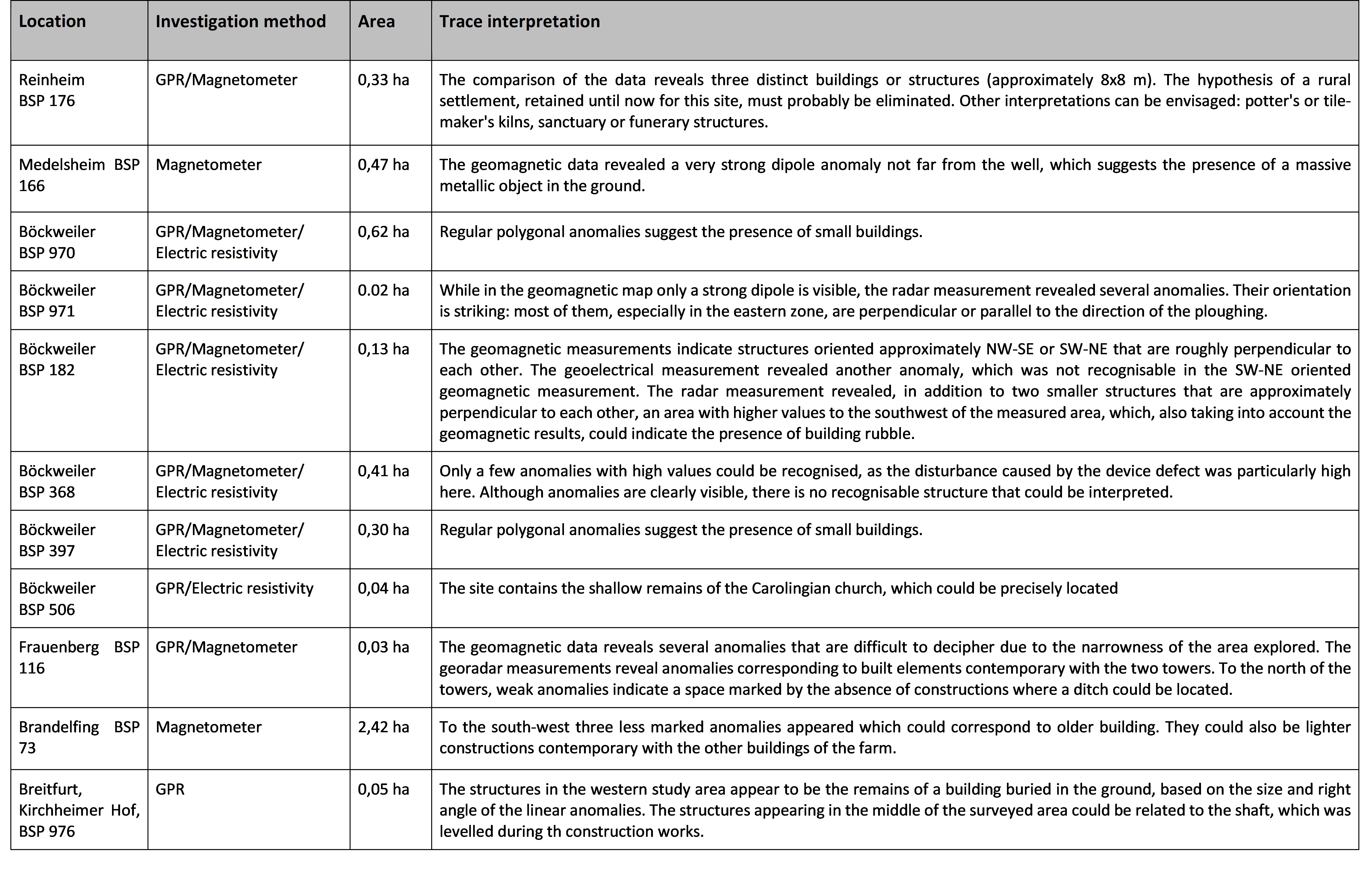 Figure 4. Summary table. Areas of geophysical survey.
