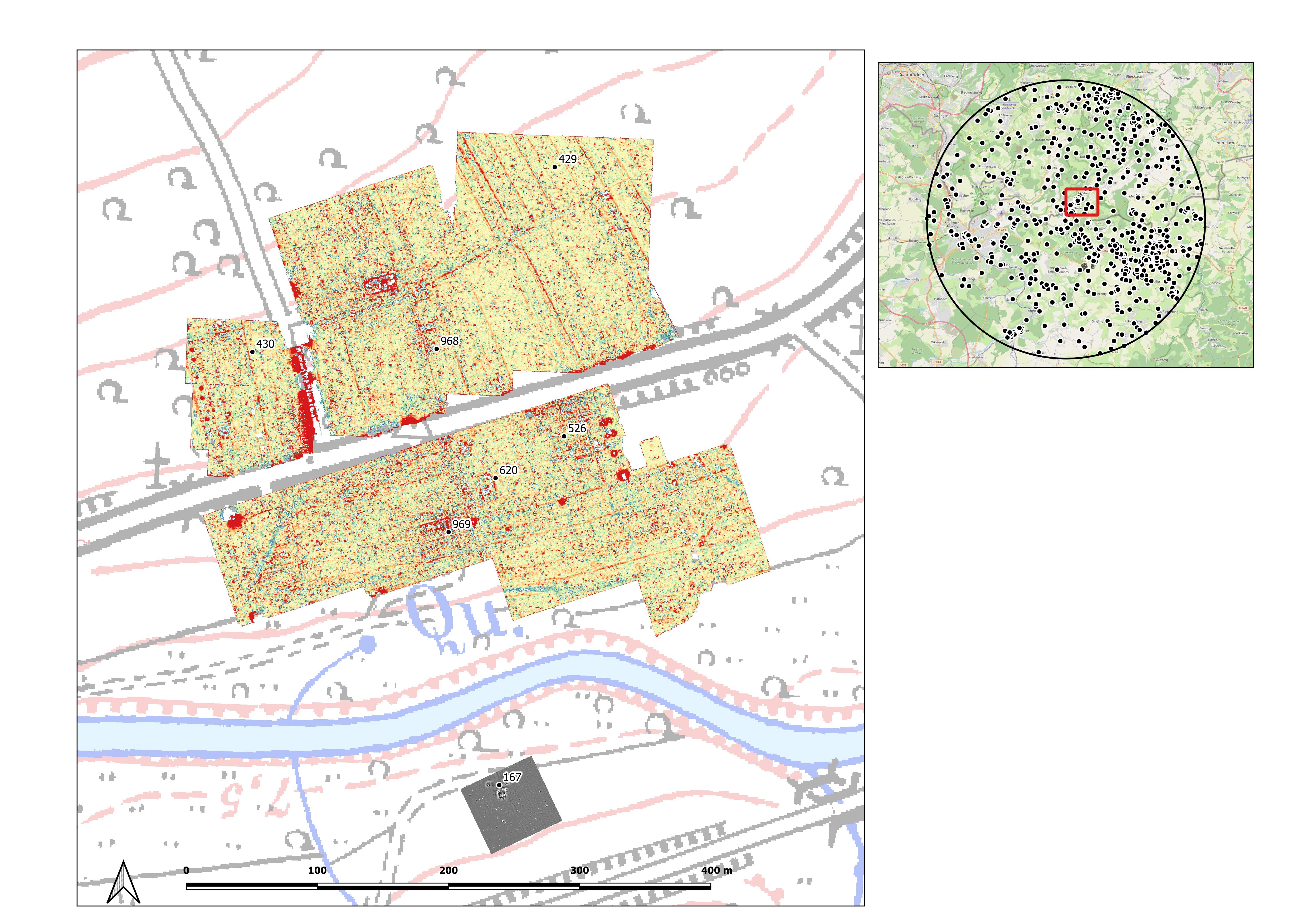 At the beginning of the 21th century, new projects started in the area, approaching the landscape with new methods and tools. The Occupation de la frange orientale du territoire médiomatrique, led by P. Nusslein and E. Thomann investigated the area between the Alsace Bossue and partially the Pays de Bitche, following the research by J.-P. Petit on the placement of minor settlements in the area (Petit 1999; Thomann and Nüsslein 2001; Nüsslein and Petit 2010). At the same time, surface prospection was led by S. Schmit in the south-eastern sector of the research area and by H. Cappel around Blieskastel (Schmit, Asselin and Detrey 2021; Blouet, Cappel and Schmit 2019; Schmit, Schnitzler and Chalte 2017). The Bronze and Iron age landscape of the region is reviewed by W. Reinhard’s work and these studies are recently put in perspective by D. Mathiot (Reinhard 2003; Mathiot 2018b). In 2004 the Carte Archéologique de la Gaule – Moselleis published, reviewing all the archaeological evidence for the French area of the project (Flotté and Fuchs 2004). The studies of A. Stinsky (2015; 2018; 2019) on Roman rural settlement patterns build on previous works such as those of R. Göring (2000) and complete them with updated excavation and survey data. Large projects as Ruhrland have inquired the rural occupation from the late Iron Age to the end of the late antiquity, redefining the settlement pattern for the north-eastern Gaul, while a spatial quantitative approach to the Roman occupation of the area has been explored by A. Nüsslein (Reddé 2017; 2018; Nüsslein 2016a; 2016b; 2018; Nüsslein et al. 2017; Nüsslein, Bernigaud, and Reddé 2018).