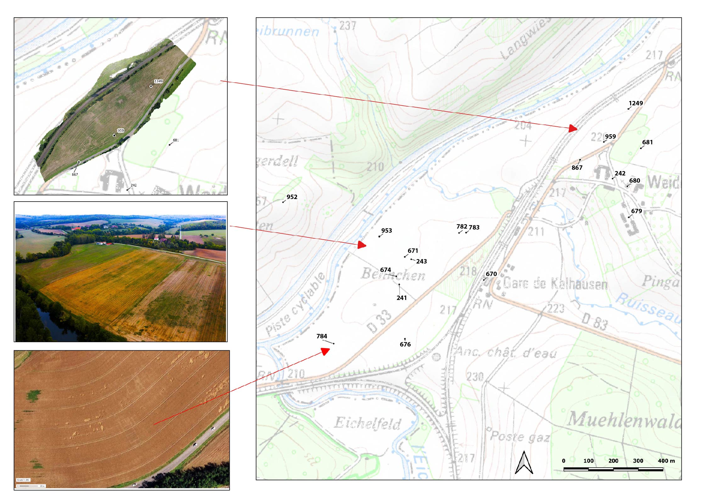 Figure 8. Kalhausen, Weidesheim. Site distribution and aerial (Géoportail, 2012) and drone photos.