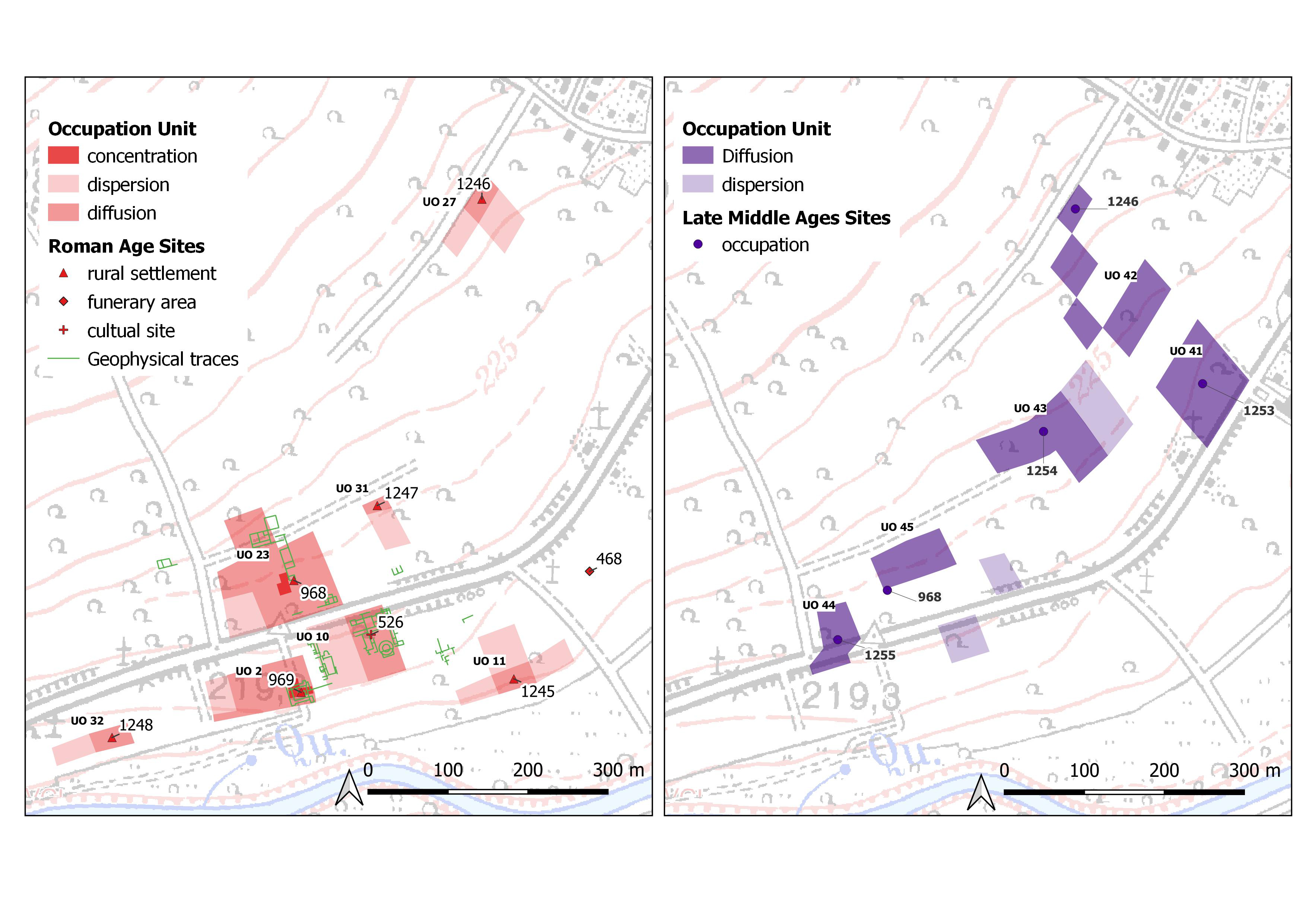 The Occupation Unit (UO) is an area characterized either by a significant presence of artefacts of determined chronologies (e.g., prehistoric flints) or where one or more high density cluster of artefacts collide. It should be noted that for some periods the amount of material surfacing is influenced by the historical and cultural character of the way in which the buildings were built: for example, the absence of tiles and a reduced diffusion of ceramic material (compared to the Roman period) in the contexts of protohistory and the early Middle Ages makes the occupation less visible, and therefore in this case it will be necessary to apply a different scale of density values.