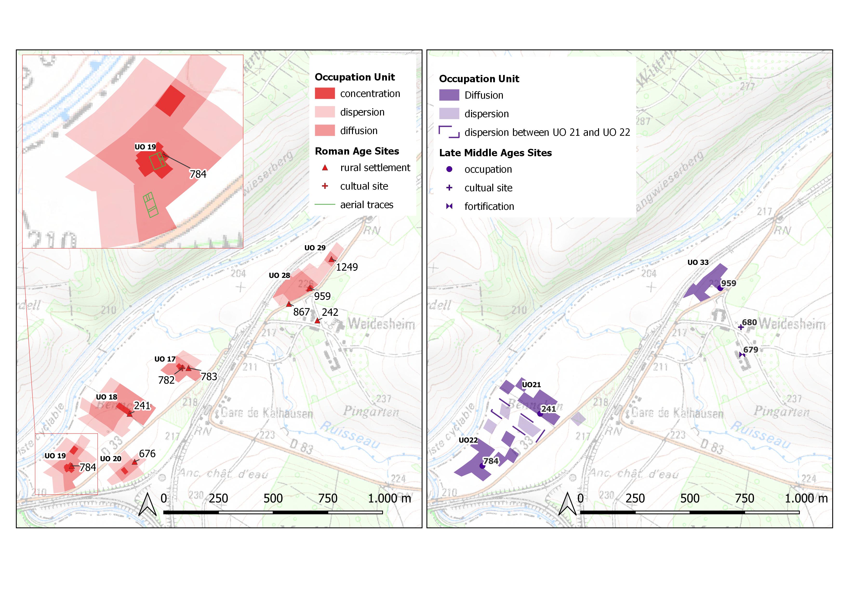 Figure 11: Kalhausen, Weidesheim. Definition of Roman (in red) and medieval (in purple) Occupation Units.