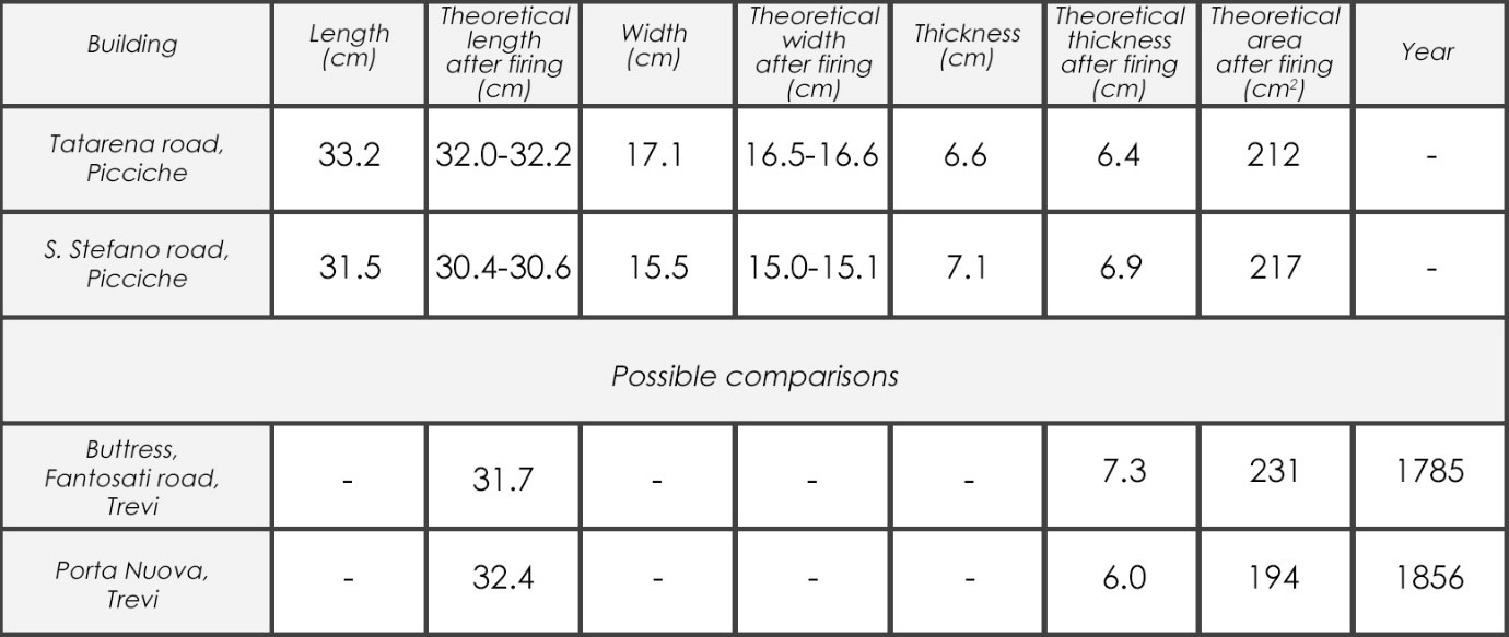 Mensio-chronology of fired bricks is considered a reliable dating method and historical-economic indicator (Mannoni, Milanese 1988). However, the application of mensio-chronological analyses on mudbricks is still an ongoing issue. The crucial point is the relationship in the production of mudbricks and their fired counterparts. Were mudbricks made by the same kilns that produced the fired ones? Or were they the output of completely different and maybe “homemade” productive chains? On the one hand, we would have bricks reasonably produced with the same standardised shapes of the fired production, although non affected by the shrinking in volume of the firing process (Pagella Poggio 1992, 19; Pittaluga, Pagella 2015, 292). On the other hand, we would have two completely unrelated productions, making any mensio-chronological approach unapplicable. The debate is still open, and its conclusions vary from region to region. For example, research has excluded a standardisation of the mudbrick production in some areas around Alessandria in Piedmont (northern Italy) (Pagella Poggio 1992, 19). At the same time, mudbricks studied in other settlements of the same regions match the size of the fired counterpart (Pittaluga, Pagella 2014, 7; Pittaluga, Pagella 2015, 292). In Umbria, the above-mentioned cases of Picciche offers three statistically valid samples to test the relationship between mudbricks and fired bricks produced. For a proper comparison with the fired production, a hypothetical 8-10% shrinking in volume after the firing process has been considered. According to this, the two samples from Picciche range between 6.4 and 6.9 cm in thickness (pl. 1). Following a regional survey I have conducted, values of 6.0 cm or above are most likely reached between the late 16th and the 19th century (Bordoni 2021 a, 287-296). This is valid in Trevi as well, with values equal to 6.0 cm or above documented in the period between the 17th and the mid-19th century. The sample from Tatarena Road is particularly interesting, with values are exactly midway between a 1785 brick buttress surveyed in Trevi and the nearby structures of the Porta Nuova (1854-1858), suggesting a possible late 18th – mid-19th century chronology.
