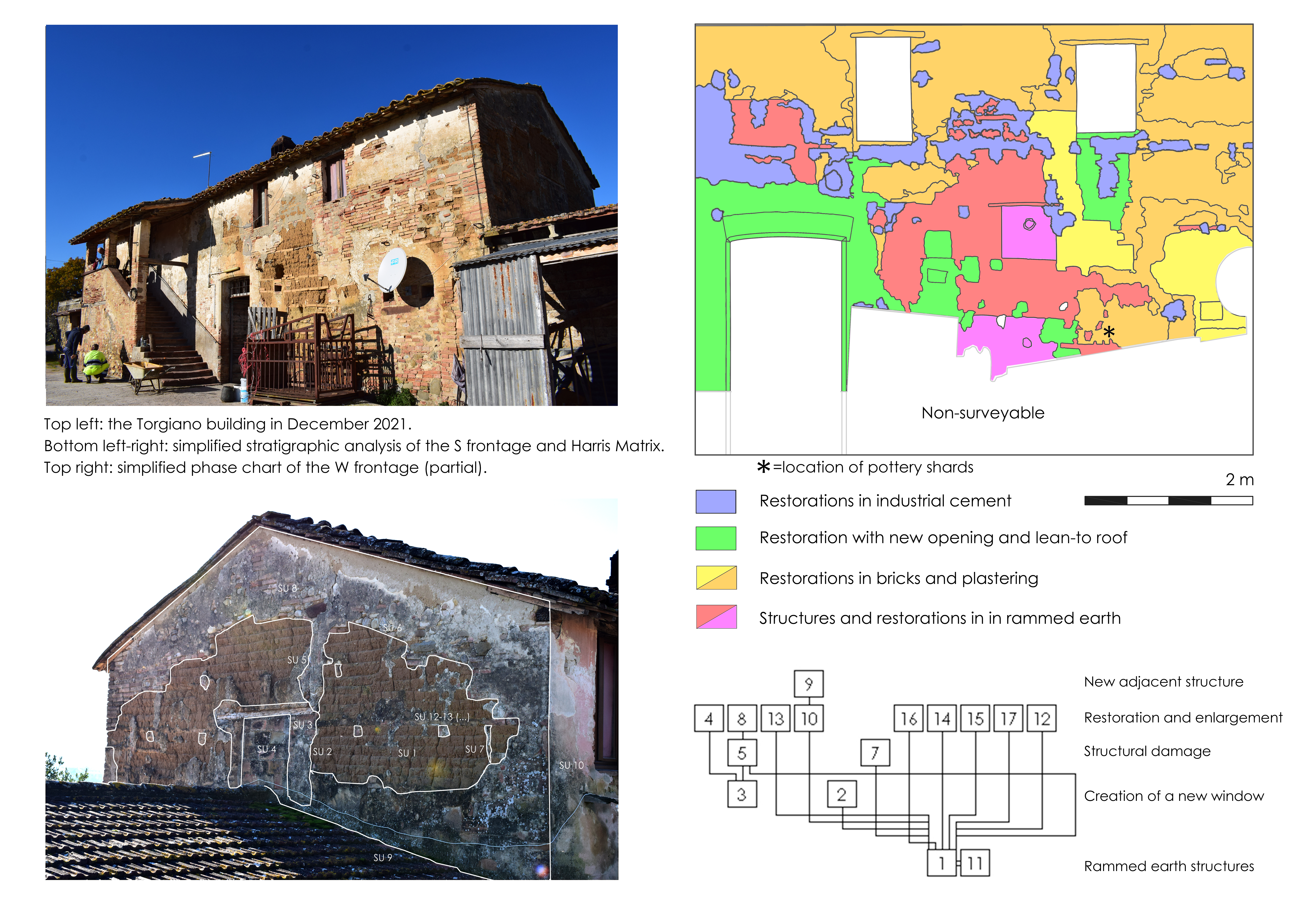 Figure 2. The Torgiano farmhouse (stratigraphic details, Harris matrix and relevant building phases).