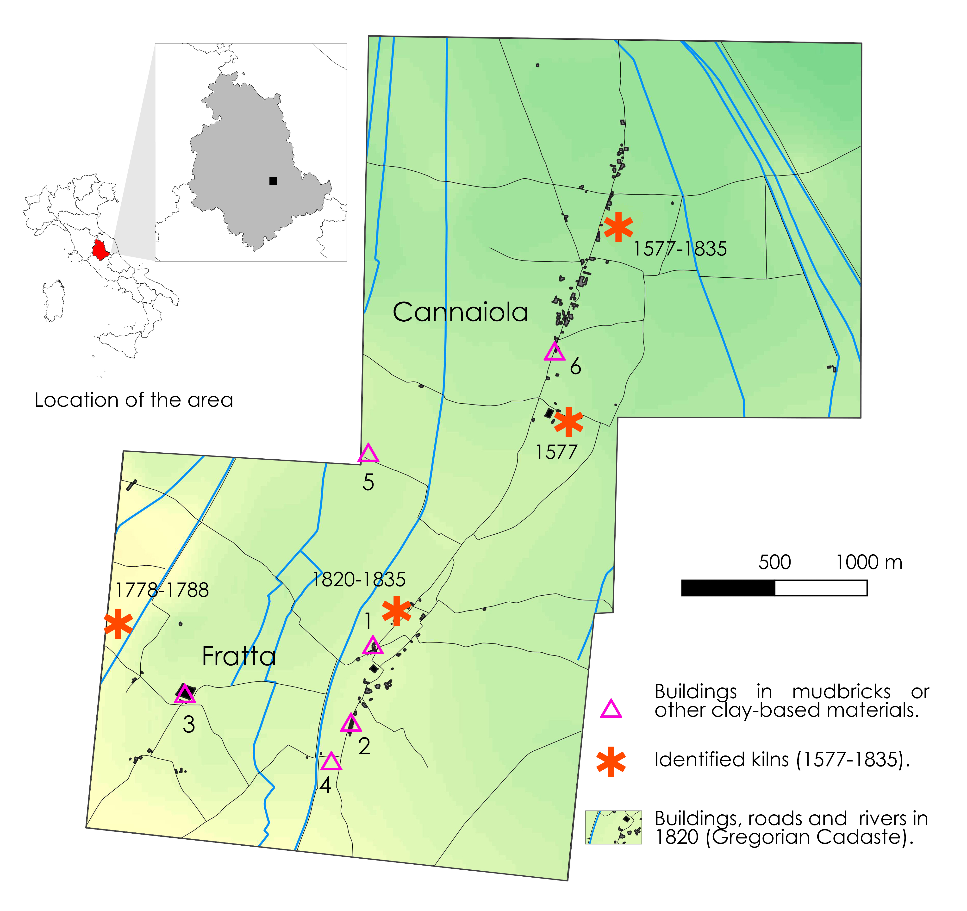 However, it is necessary to find evidence on the production of mudbricks by the local kilns to validate the application of mensio-chronology on the production of building material. To verify this possibility, I have invested part of this research in the well-documented local archive. A production of bricks in the Trevi district is demonstrated since the first half of the 15th century (Bordoni 2019, 49-50). However, a series of still not published documentations underlines the extent of such production and its later shift from Cannaiola to nearby Fratta around the mid-18th century. In fact, mudbrick structures cluster in an area where there are at least five identifiable kilns recorded between the second half of the 16th and the mid-19th century (Figure. 3) 22.