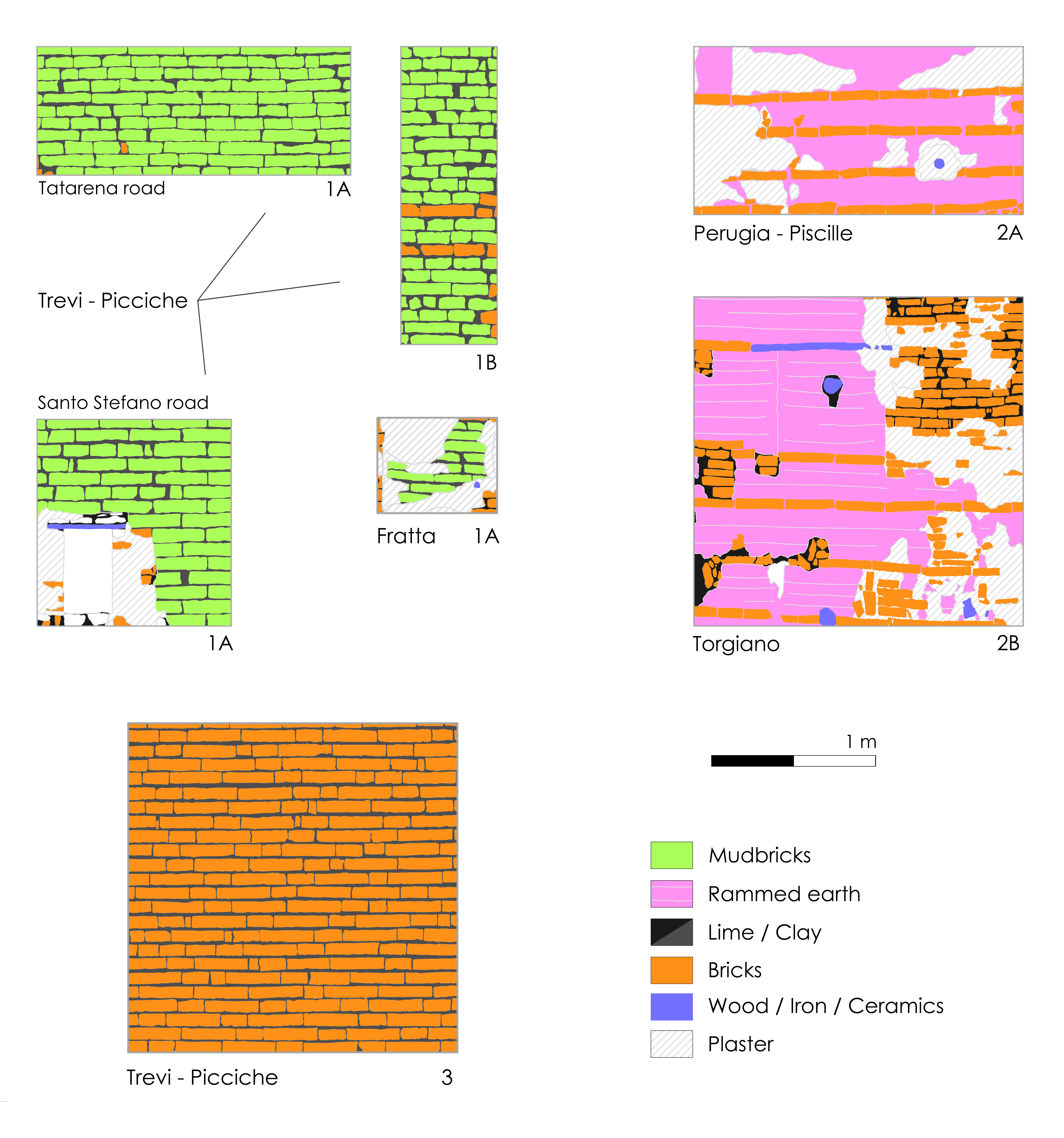 - Countryside of Trevi. Besides Natalucci’s testimony above (1745), it has been possible to survey five structures partially composed of mudbricks. Two of them are in the village of Picciche, two in Cannaiola and one in nearby Fratta (within the municipality of Montefalco since 1816) 9. They can all be interpreted as modest residential buildings. In Picciche, oral witnesses document the other earthen structures identified during restoration works 10. In the same village, another structure (seemingly an isolated aristocratic dwelling) is built with fired bricks bound with clay 11.