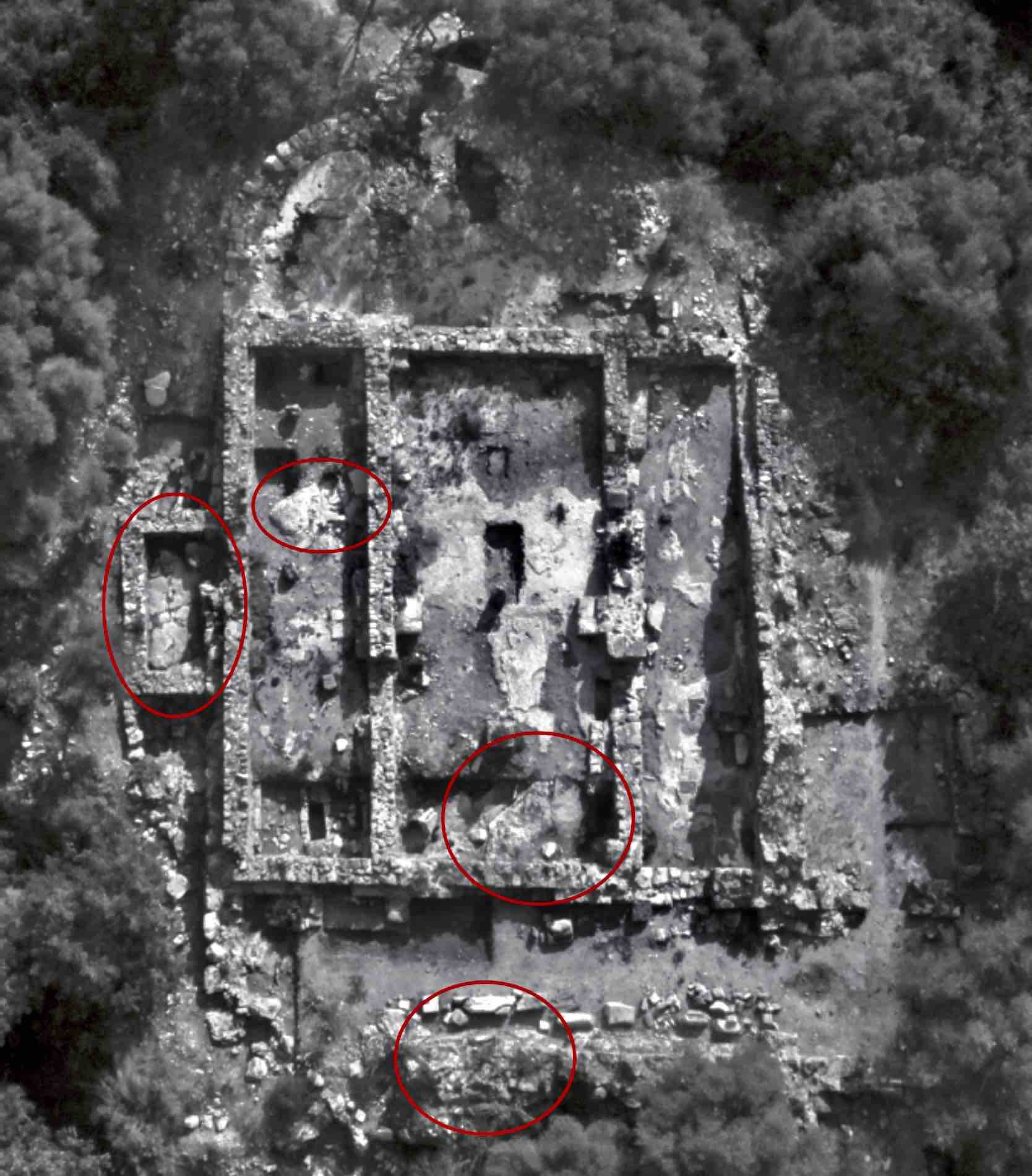 After cleaning the area, it became evident that part of the bedrock had been subject to human action, as it can easily be seen both on the flattened surface of the cuttings within the Basilica area, in the side room, and on the three parallel cuts on the boulder just outside the Basilica, which are too sharp to be the product of natural erosion. Nevertheless, at the present state of knowledge, there are no means of assigning a precise chronology to them. It is not possible to define their eventual purpose or to date them to a specific human intervention, that is the levelling of the hill for the construction of the Archaic temple, the construction of the Late Antique Basilica or the construction of the Venetian fort. Consequently, this uncertainty can be extended to the rock cuttings identified by Hernandez. Even deciding to set aside the different orientation of the cuts of the so-called east and west sides and the ones of the lateral room and on the boulder — which would pose some complication in the reconstruction of the sacred area already by themselves — there is still the obstacle of their different heights. The presence of a significant difference in height between the parts involved had emerged already on site during the cleaning operations preceding the topographical survey, and it was confirmed during the re-elaboration of the data obtained from the Laser Scanner point clouds. The difference is particularly evident between the highest of the cuts on temenos/krepidoma boulder and the set of cuttings of the so-called east wall (difference of 0.50 m), as well as between the latter and the cuttings of the so-called west wall (difference of 0.70 m). A similar situation is also present between the room on the side of the Basilica and the so-called east side, in fact the surface of the latter is 1.02 m higher than the floor of the room. It is not clear how this difference in altitude could be fitting into the construction of a temple, since it would have implied the presence of a base of some kind, whose remains are not visible as well. These considerations highlight how it is not possible to directly relate the actions seen on the bedrock to the construction of the Archaic temple, while they can be equally linked to the phases of the Late Antique Basilica or the Venetian fort.
