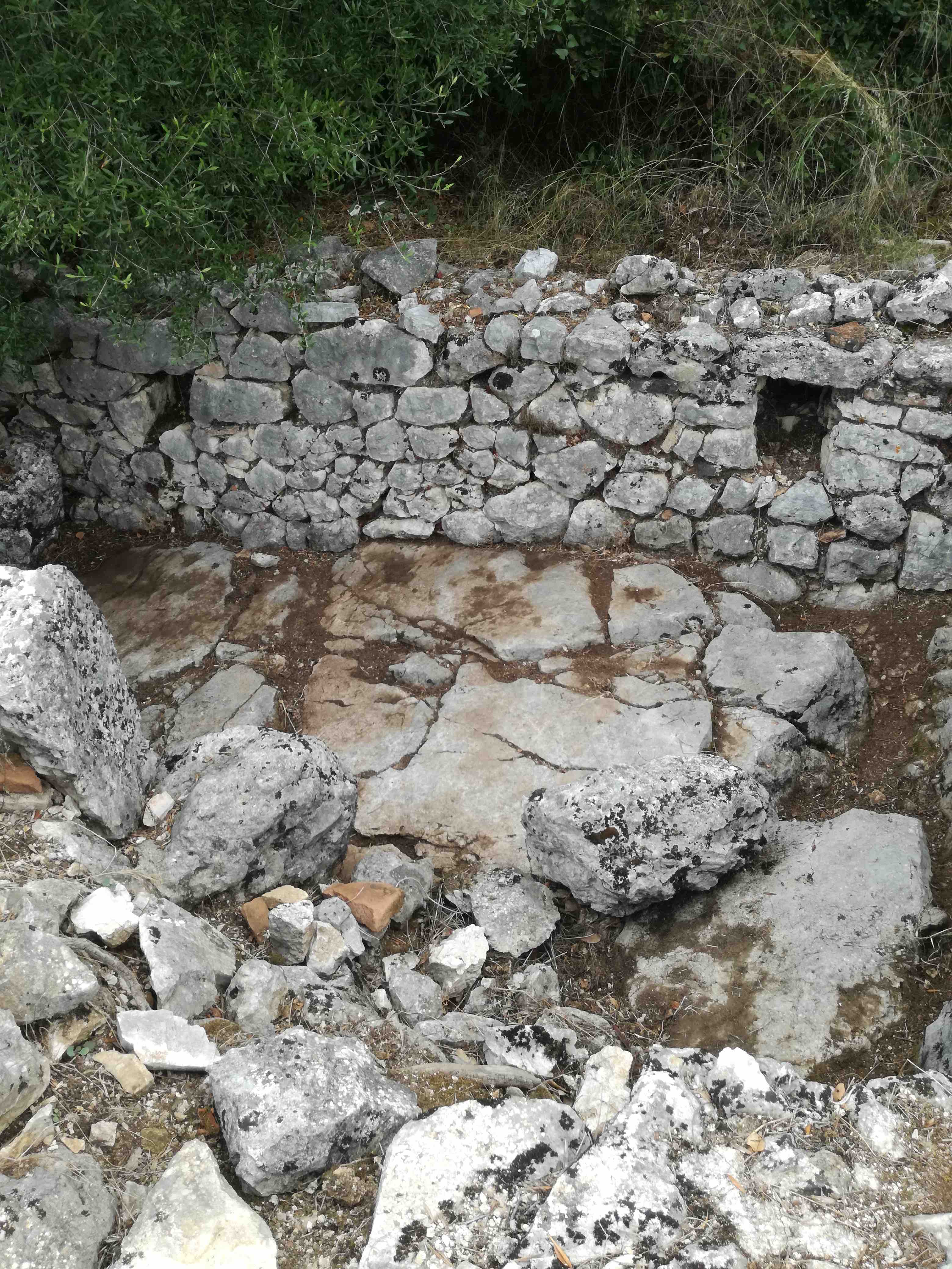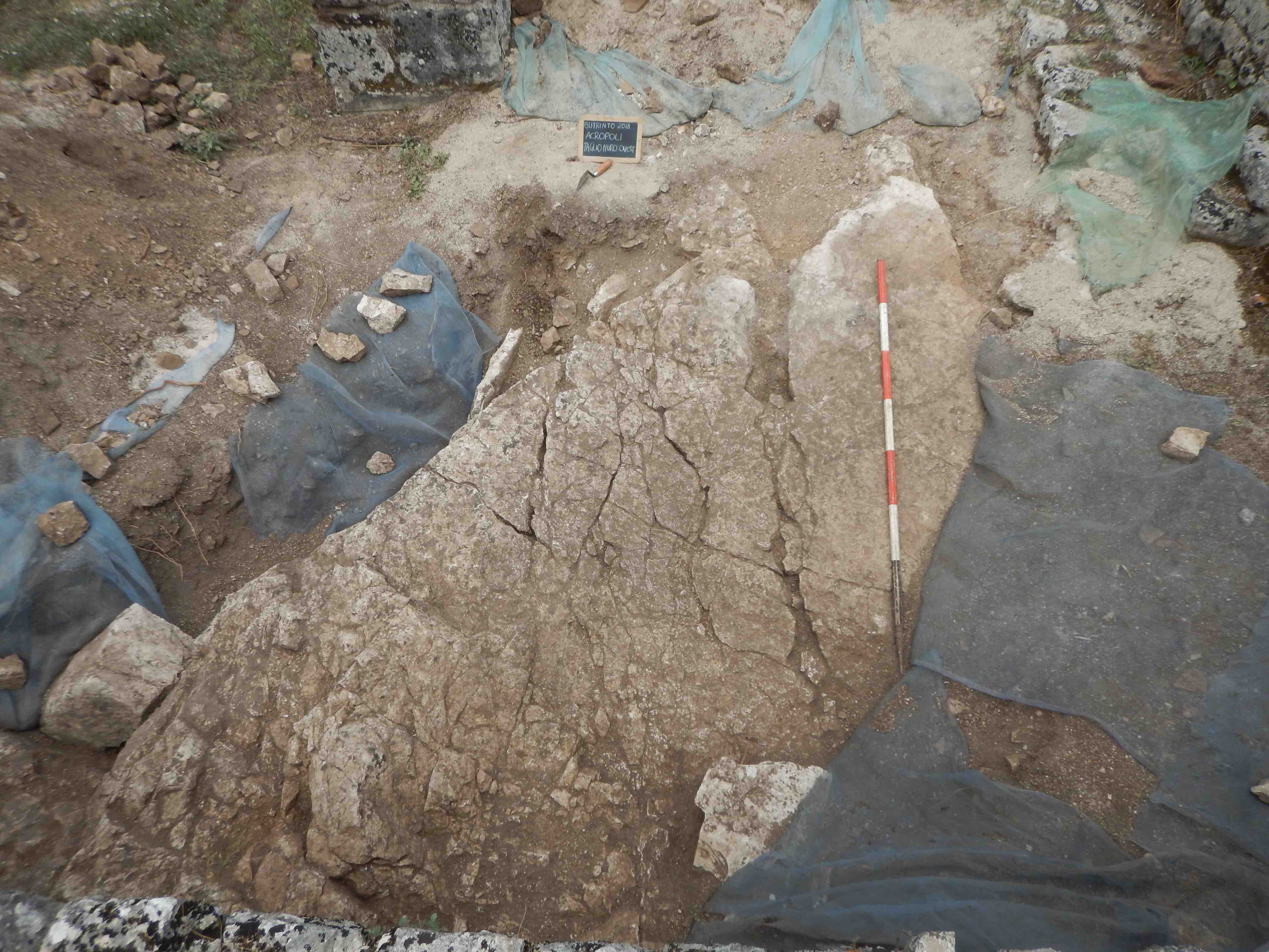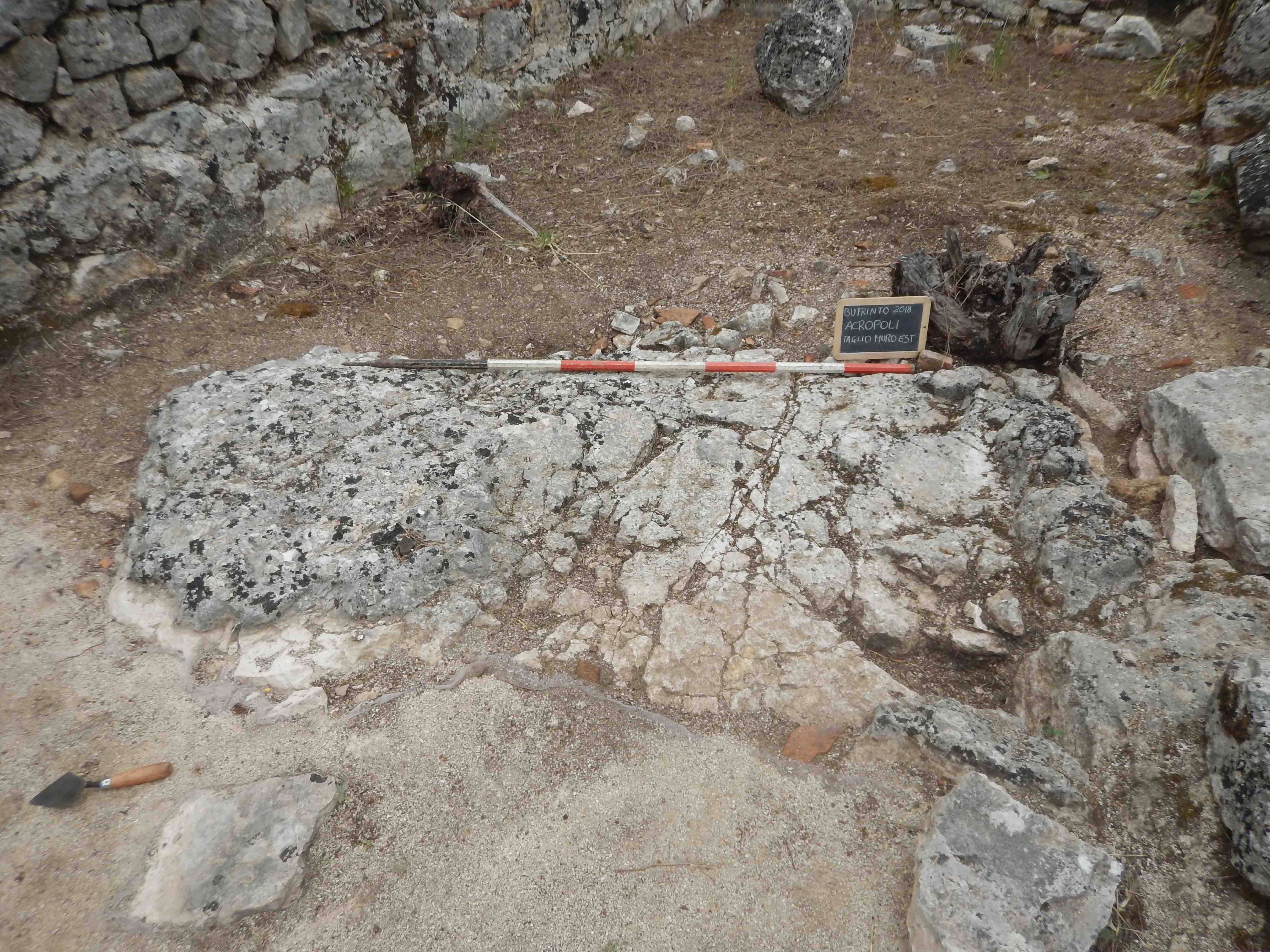 In 2018 the team of the Archaeological Mission of the University of Bologna and the Archaeological Institute of Tirana in Butrint (Butrint Project) decided to focus part of their efforts on the study of the acropolis of Butrint and unveil the traces located by D. Hernandez in order to better understand the stratigraphy of the upper plateau of the hill (Figure 7).https://site.unibo.it/butrint/en) is an Albanian-Italian research project by the Department of History and Cultures of the University of Bologna and the Albanian Institute of Archaeology in agreement with the Albanian Ministry of Culture and Butrint National Park and with the support of the Italian Ministry of Foreign Affairs and the University of Bologna. The project was established in 2015 with the aim of conducting degradation mapping and topographic survey with laser scanning technology of the sanctuary of Asclepius and the wall circuit. Starting in 2018, these activities have been joined by the stratigraphic excavation of some sections of the Hellenistic wall circuit and later in 2019 of the Acropolis area. Giorgi, Muka 2015; Muka, Giorgi 2017, 2018; Benfatti et al. 2020; Giorgi, Lepore 2020; Giorgi 2022; Giorgi, Muka 2023.">12 The first set of these rock cuttings is located in the left aisle of the Acropolis Basilica, close to the apse, where Hernandez recognises cuttings that would allow to reconstruct the size of the blocks forming the walls of the Archaic building, oriented NW-SE, and which would represent the east side of the temple (Figure 8). A second similar and parallel set of cuttings is located southwest, in the central nave, close to the narthex, which would be the west side of the temple (Figure 9). Finally, a third set of rock cuttings, parallel to the previous two, is located outside the area of the basilica, not far from it, on the top of a large boulder, which could have been part of the temenos of the temple, or the foundation for its crepidoma (Figure 10). There are two other evidences identified by Hernandez, although less relevant for the purpose of reconstruction: a small room on the north side of the basilica, connected to the left aisle, with a rocky surface which he interprets as part of the temple or temenos (Figure 11); and a cavity carved into the bedrock, perhaps used for drainage, on the side of the right aisle. The area investigated was restricted to the first three set of evidence identified by Hernandez, which means that only the bedrock already involved in the excavation campaign conducted here in 2009 was exposed, without involving neither other areas of the Basilica nor the whole extension of the bedrock on the summit of the acropolis.