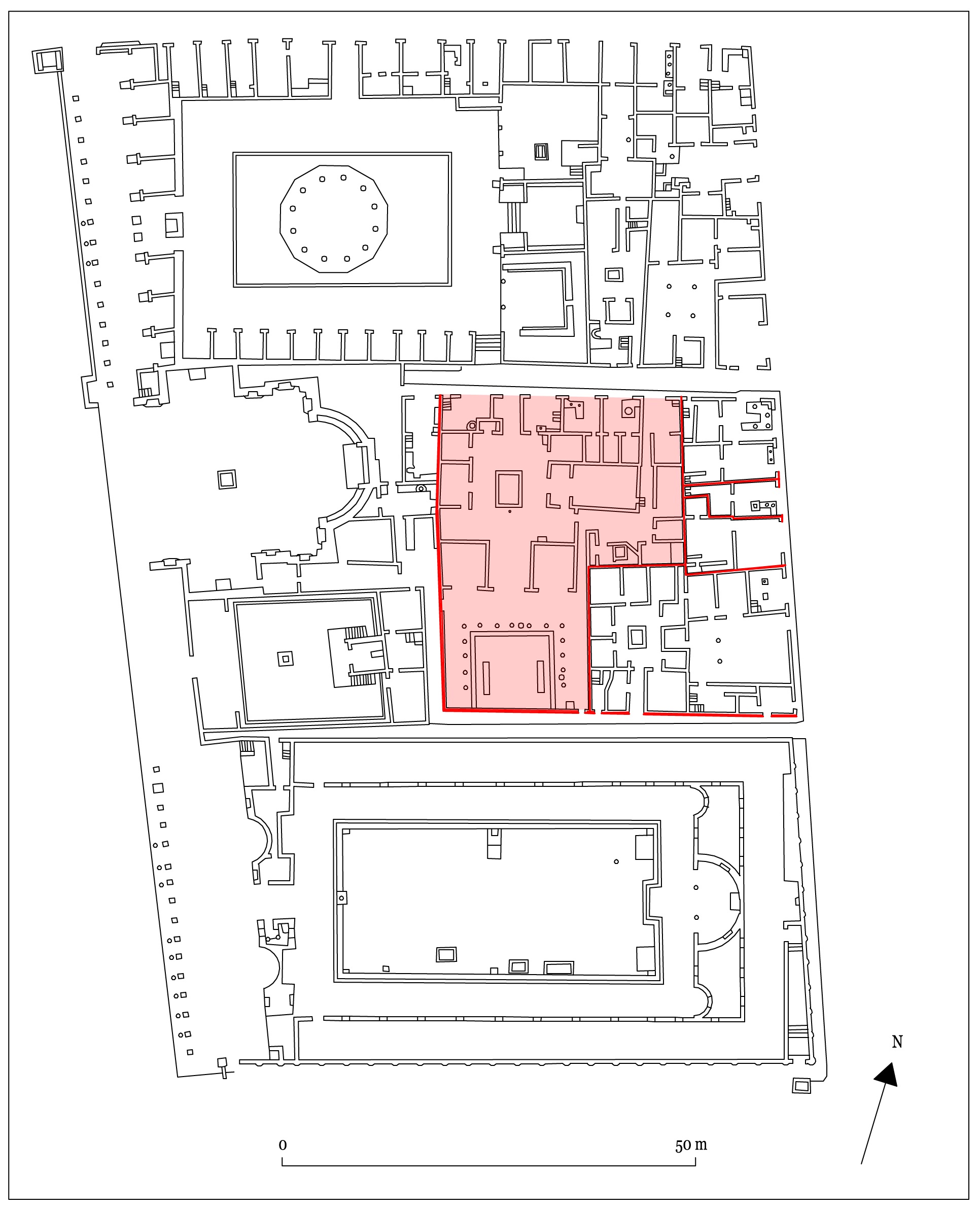 Figure 8. Pompeii, Regio VII, insula 9: proposal of reconstruction of the Samnite buildings found below the Casa delle Nozze di Ercole (VII, 9, 47). In black the documented structures; in gray the logically reconstructable environments; in white the hypothetical integrations (D’Alessio 2008, p. 278, Fig. 8)