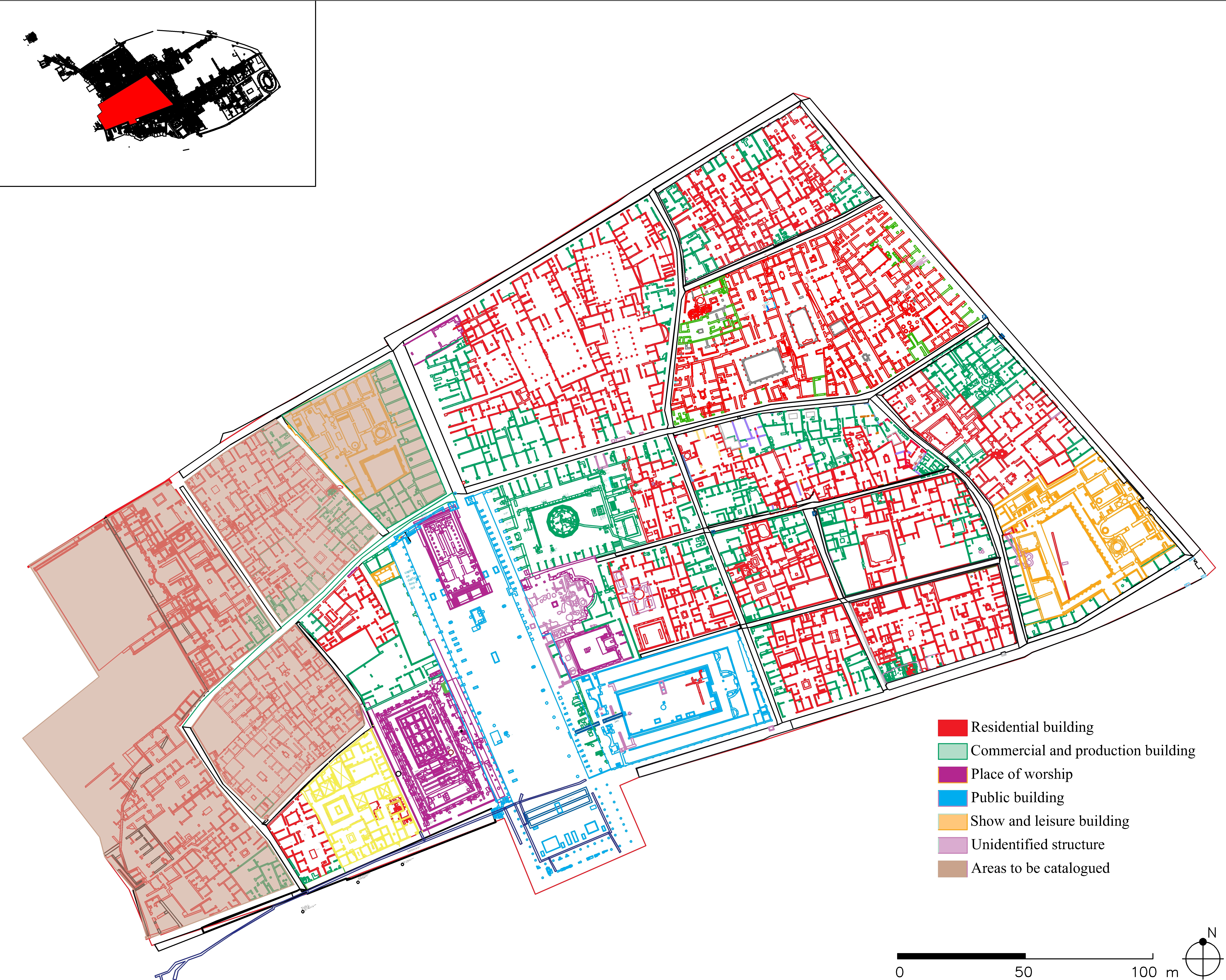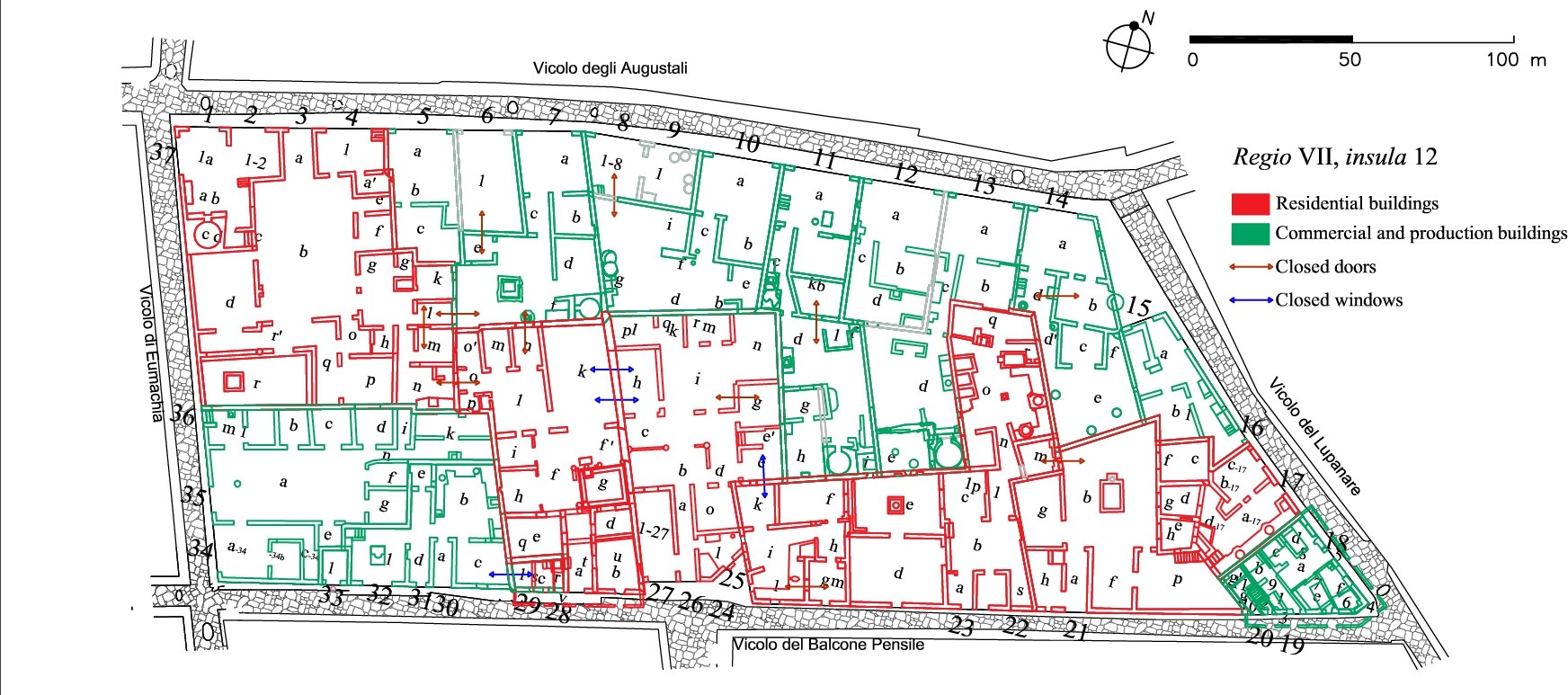 The RegioVII has an extension of about 8 ha and is divided into 16 insulaeof different sizes and functions. As is known, the central area is occupied by the Civil Forum, composed of public, commercial and cult buildings placed in close connection with the square. Two thermal complexes, the Stabian Baths and the Forum Baths, are known. In addition to the numerous domus, many buildings with commercial and productive functions (tabernae, cauponae, thermopolia, pistrina, etc.) have been documented (Figure 4).