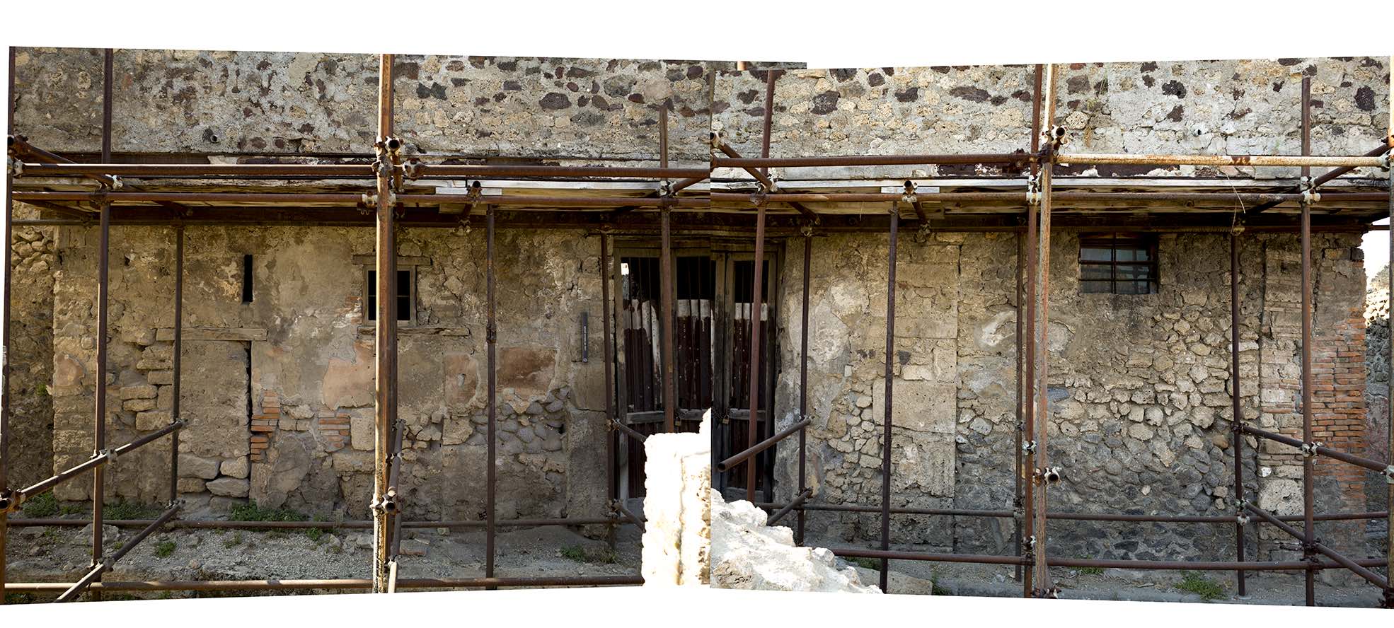 Figure 6. Pompeii, Regio VII, insula 12: the facade of the Casa del Balcone Pensile (VII, 12, 28). On the left, the buffered doors of number 29 (Photogrammetry by ‘Great Pompeii Project’. Topographic Referent: P VII 12 S3. Licensed by the Ministry of Culture - Archaeological Park of Pompeii: reprints or duplicates are forbidden).