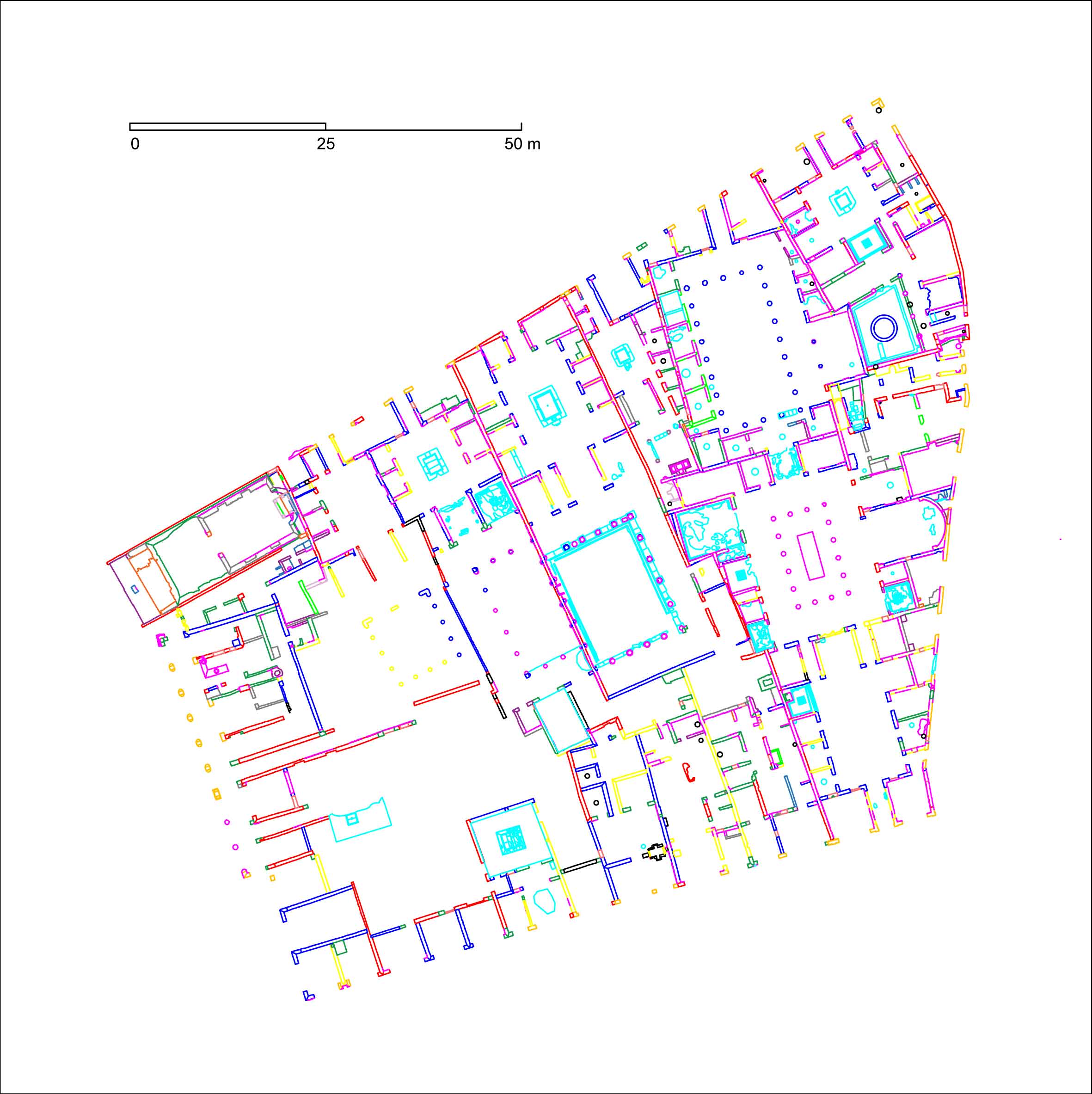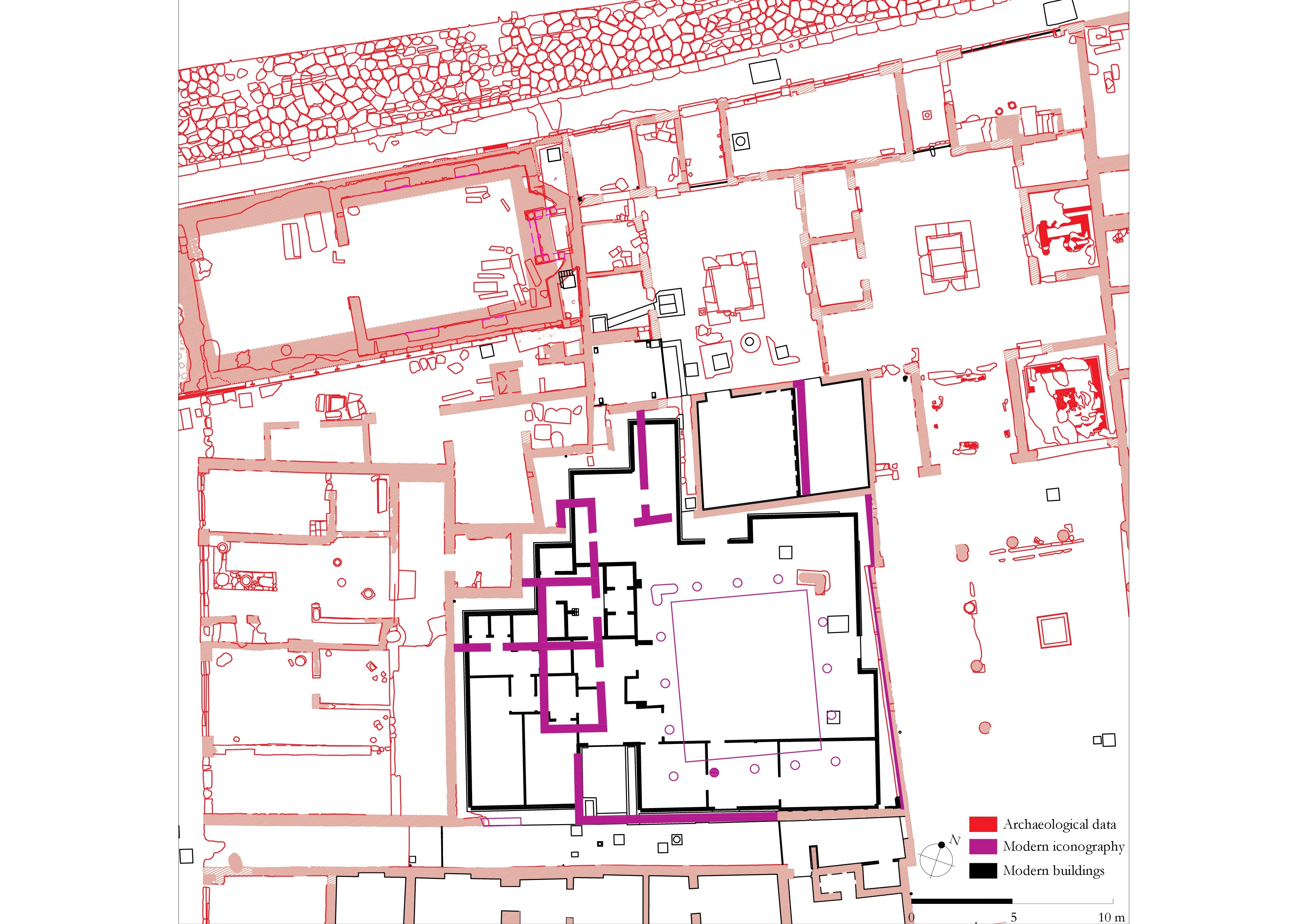 The general plans represent all the archaeological evidence visible today, on a 1:1 scale and georeferenced. The evidence is divided into layers that identify the elements based on the type of unit (ancient structures, either sectioned or projected; modern structures; plasters; other elements, such as floors, roads, objects). The plans are accompanied by a dense network of absolute altitudes, positioned on ancient and modern walking levels. Furthermore, the drawings of structures of the wall are filled with different hatches, which generically indicate the construction techniques documented at the height of the plan cut.