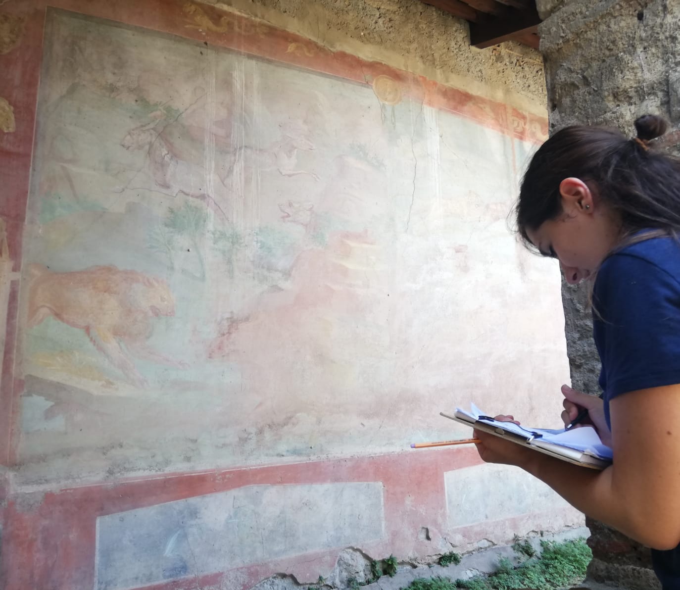 Figure 9. On field work: Elena Pavanello in the viridarium of the Casa delle Quadrighe (VII, 2, 26).