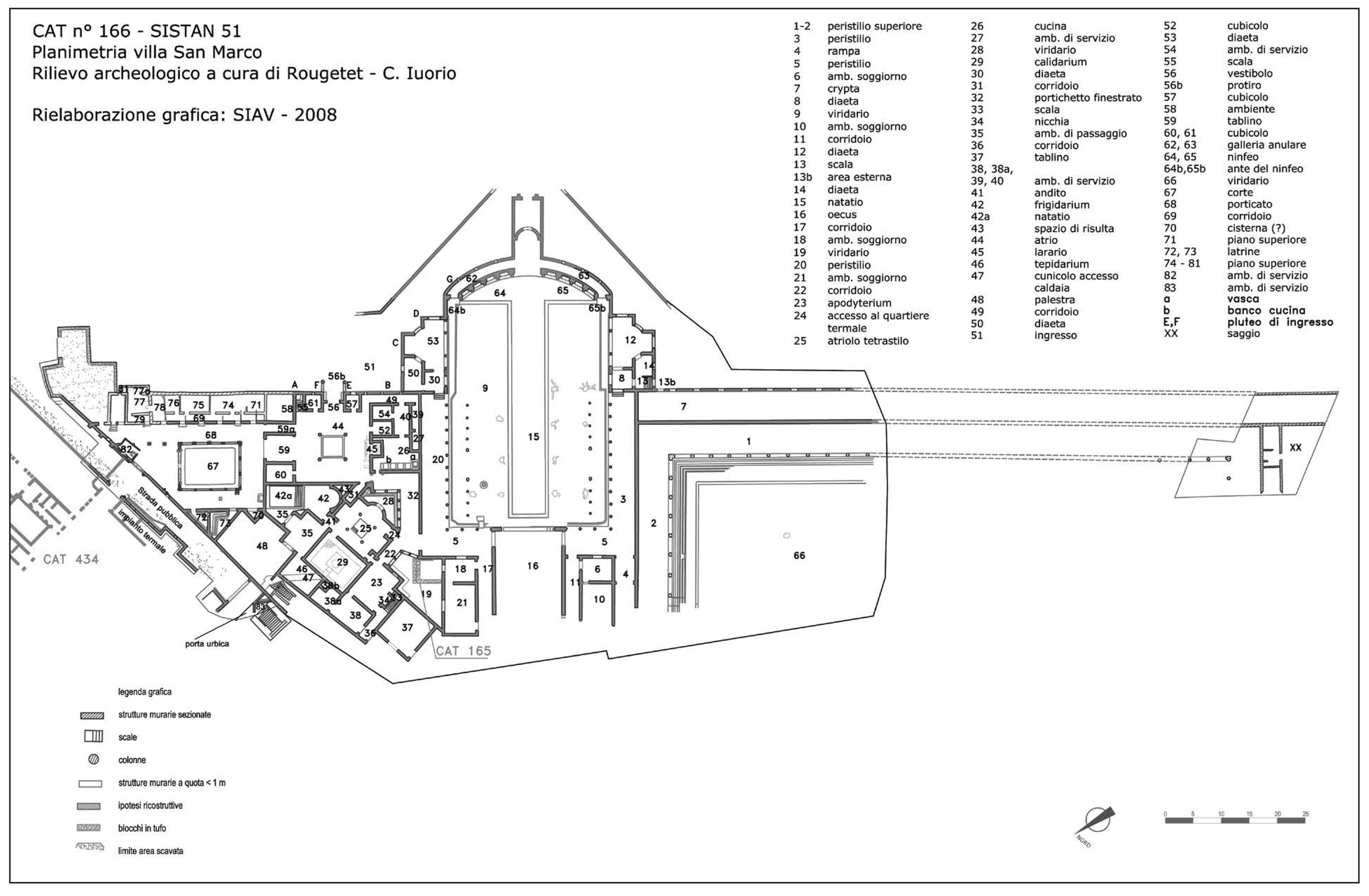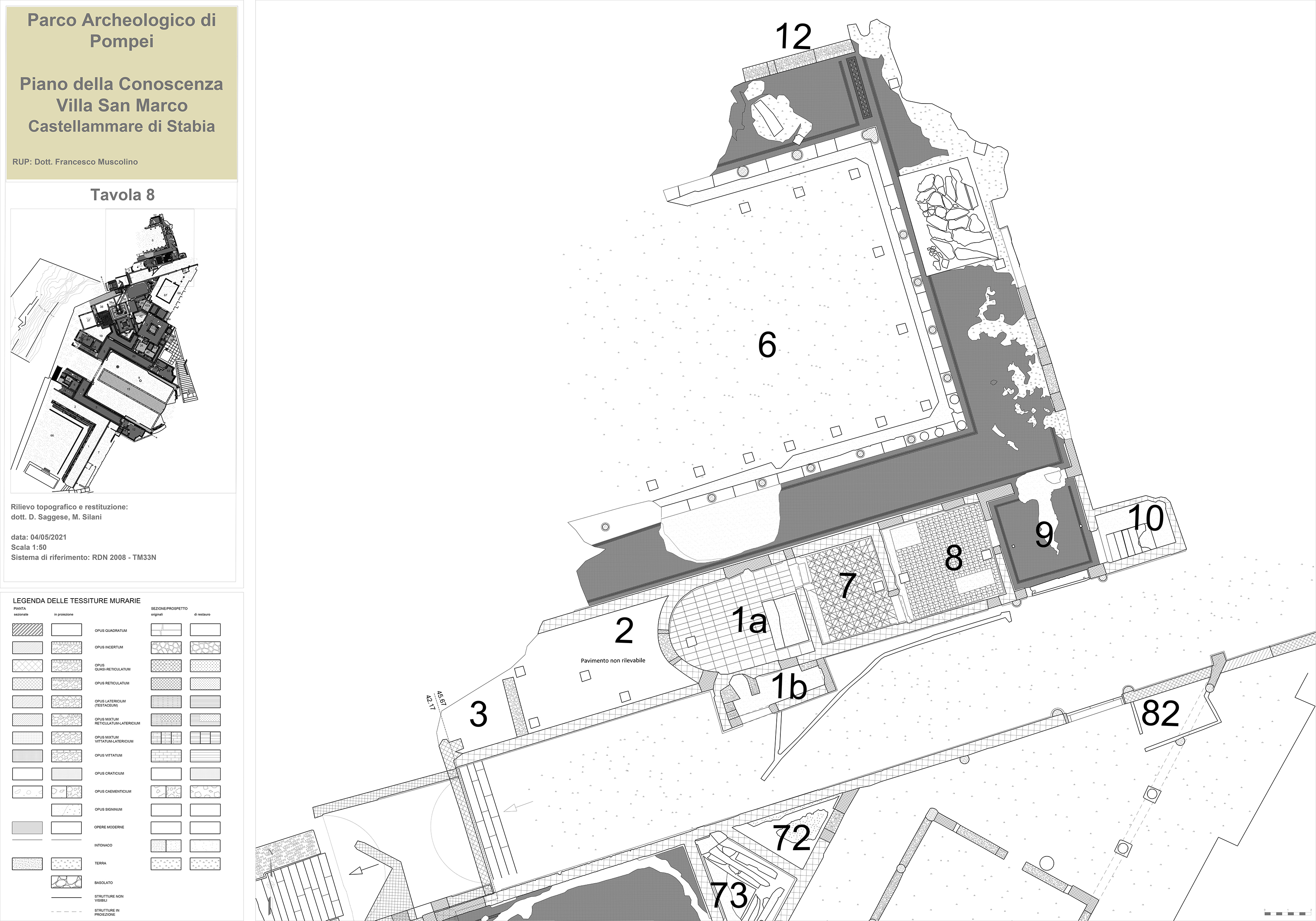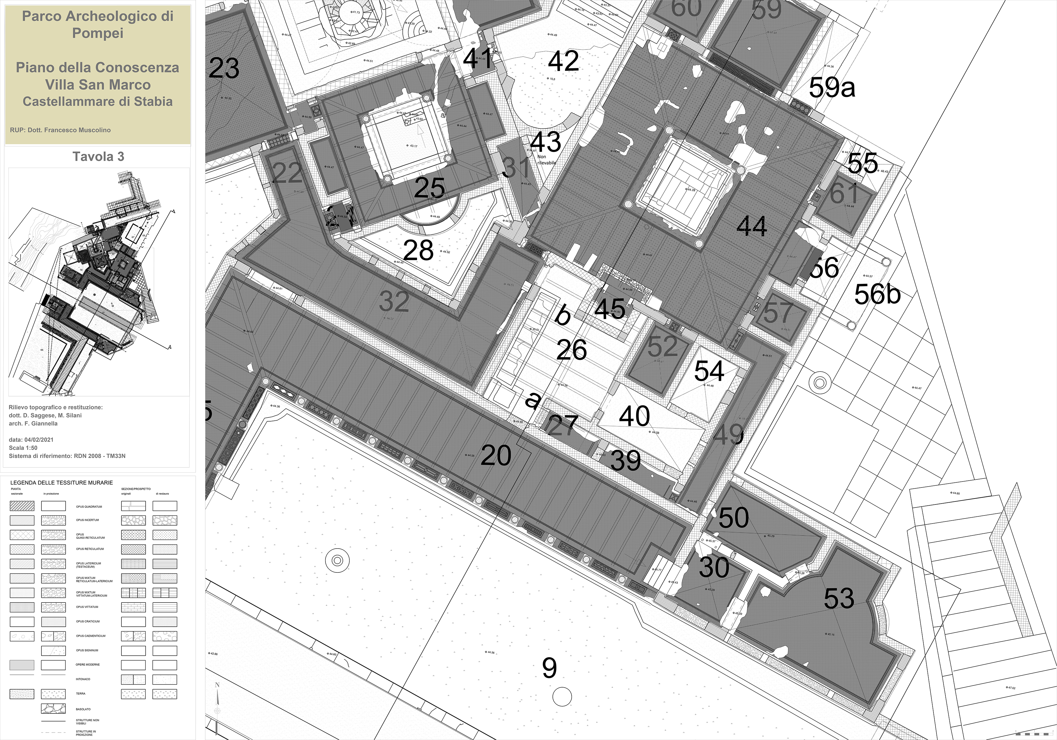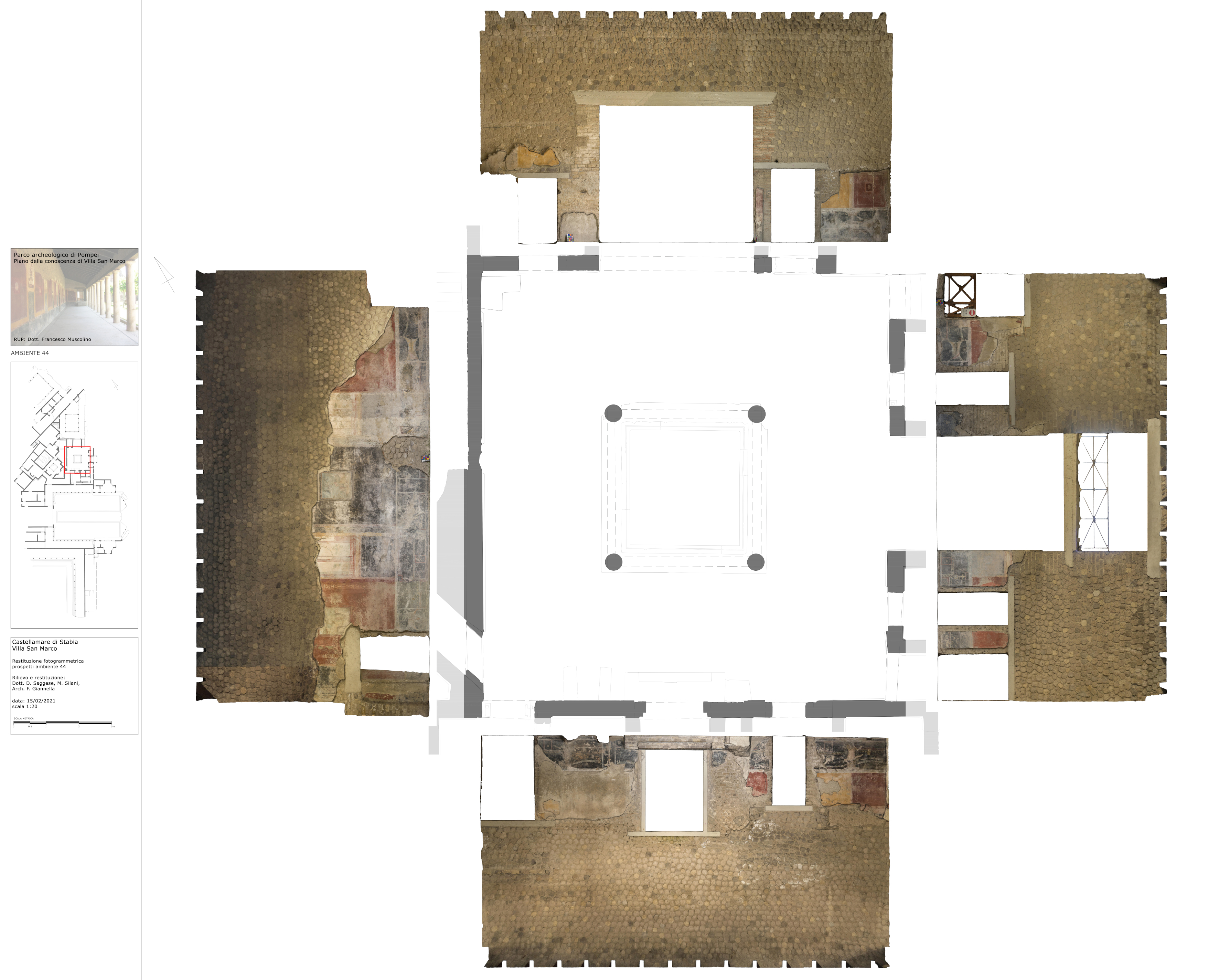 However, this is complicated by the fact that the analysis of the stratigraphies of the walls of the building appears difficult due to the various events that have affected the Villa San Marco monument since its rediscovery in 1749: for instance, the extensive and invasive restoration work carried out by d’Orsi from 1951 onwards, a time when the precarious static condition of the ancient masonry, heavily damaged by the destructive power of the pumice and lapilli produced by eruption of Vesuvius in 79 AD was perceived; the countless breaches opened in the masonry by the Bourbon excavators; the overall reconstruction that the monument underwent due to the significant damage caused by the earthquake that struck Campania in 1980.