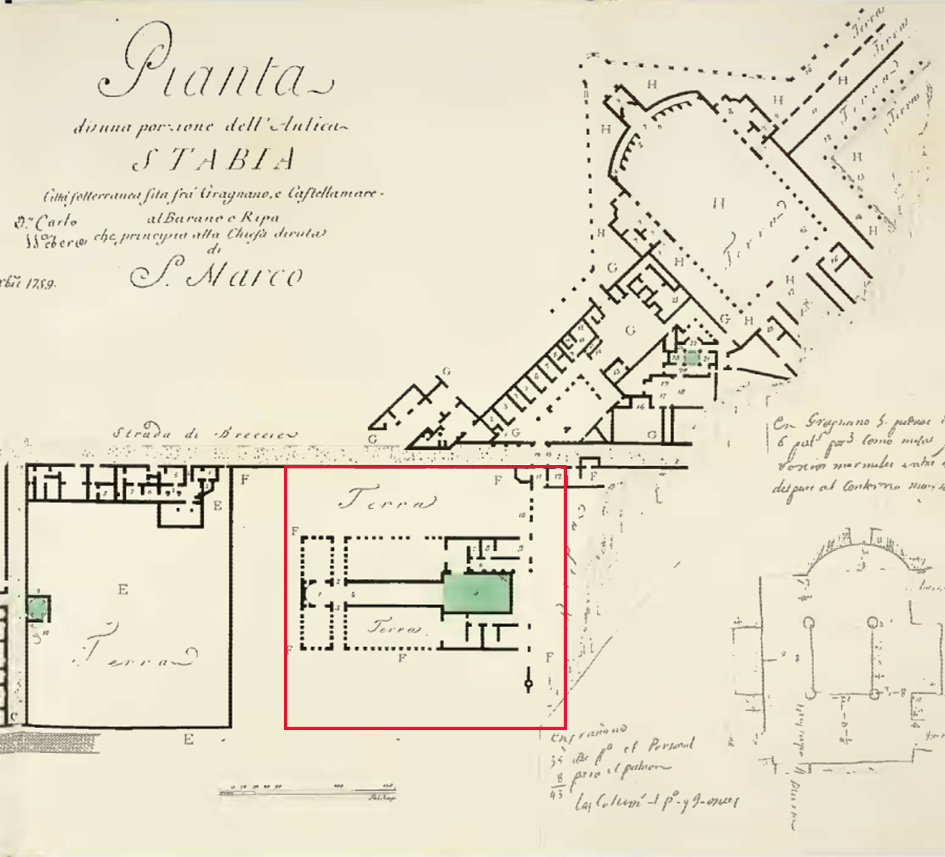 Figure 5. Stabiae. Excerpt from Karl Weber’s plan. In red the building investigated in the 18th century (author’s re-elaboration from Ruggiero 1881, Tav. I, 184).