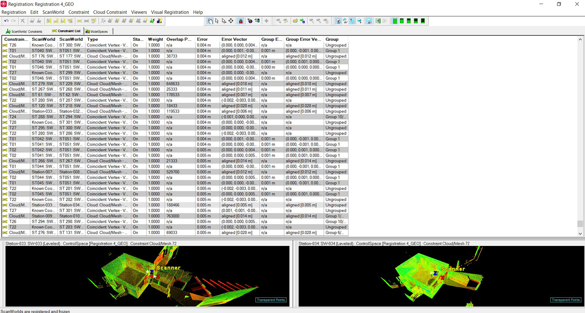 Leica Cyclone 9.1.4 handles this operation in two different ways. The first exploits the potential of the ‘Cloud-to-Cloud’ algorithm, which allows point clouds to be aligned by having the software recognise homologous points—mostly geometries—between them, giving them manual docking constraints. In general, for the recognition to be successful, at least three points should be constrained, preferably on the three x-y-z axes and well distributed in space.
