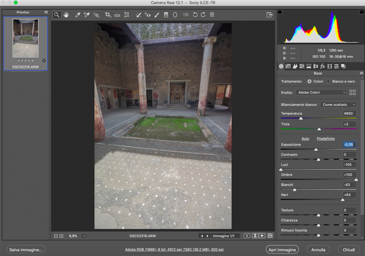 Figure 11. Calibration of spherical images in Adobe Photoshop CameraRaw (author’s elaboration)